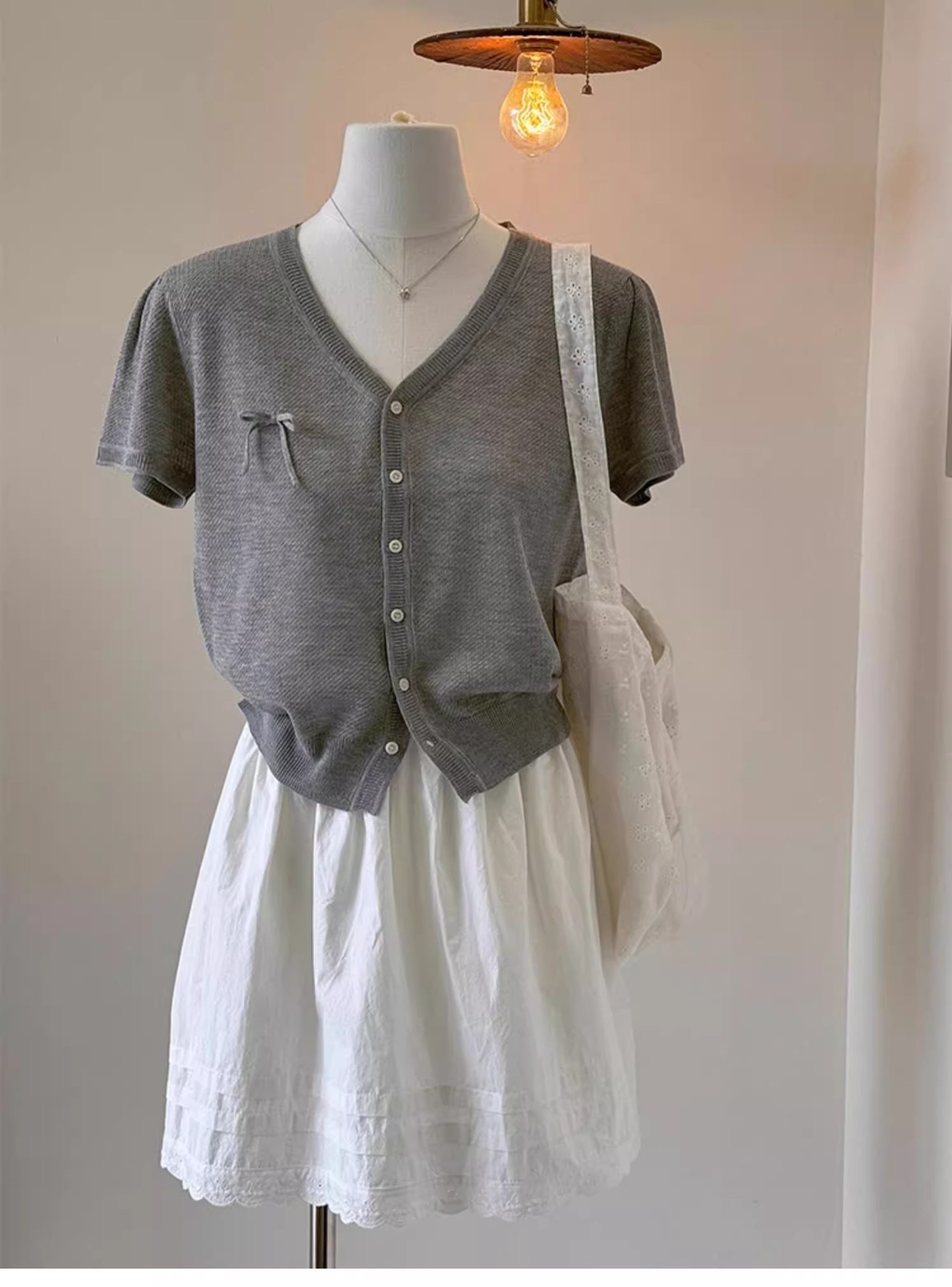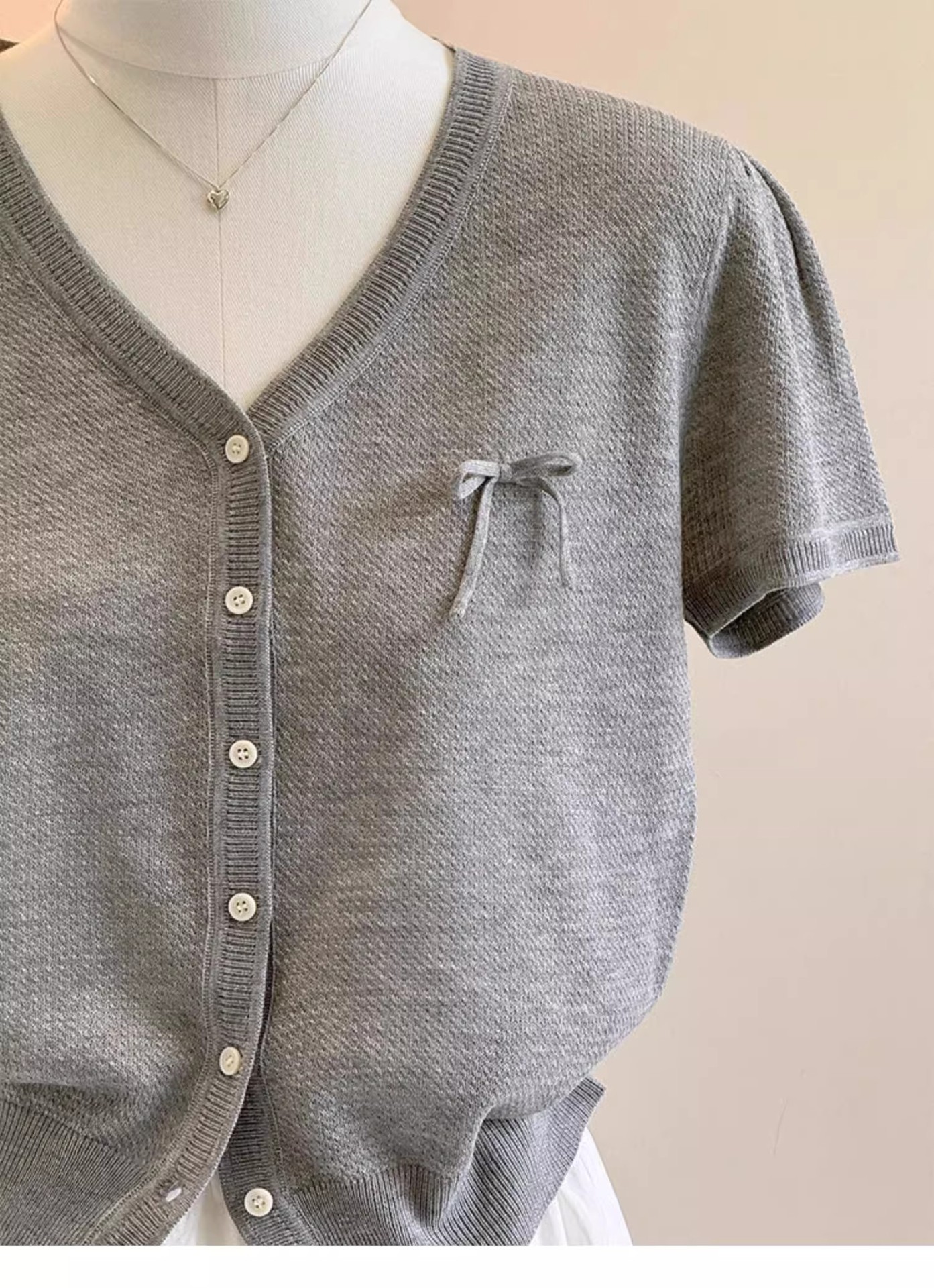 한국 스타일 그레이 아이스 실크 보우 V 넥 반팔 니트 티셔츠 여성 여름 작은 슬림 핏 짧은 칙 탑