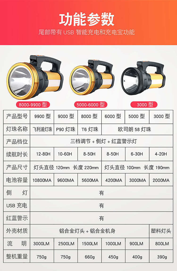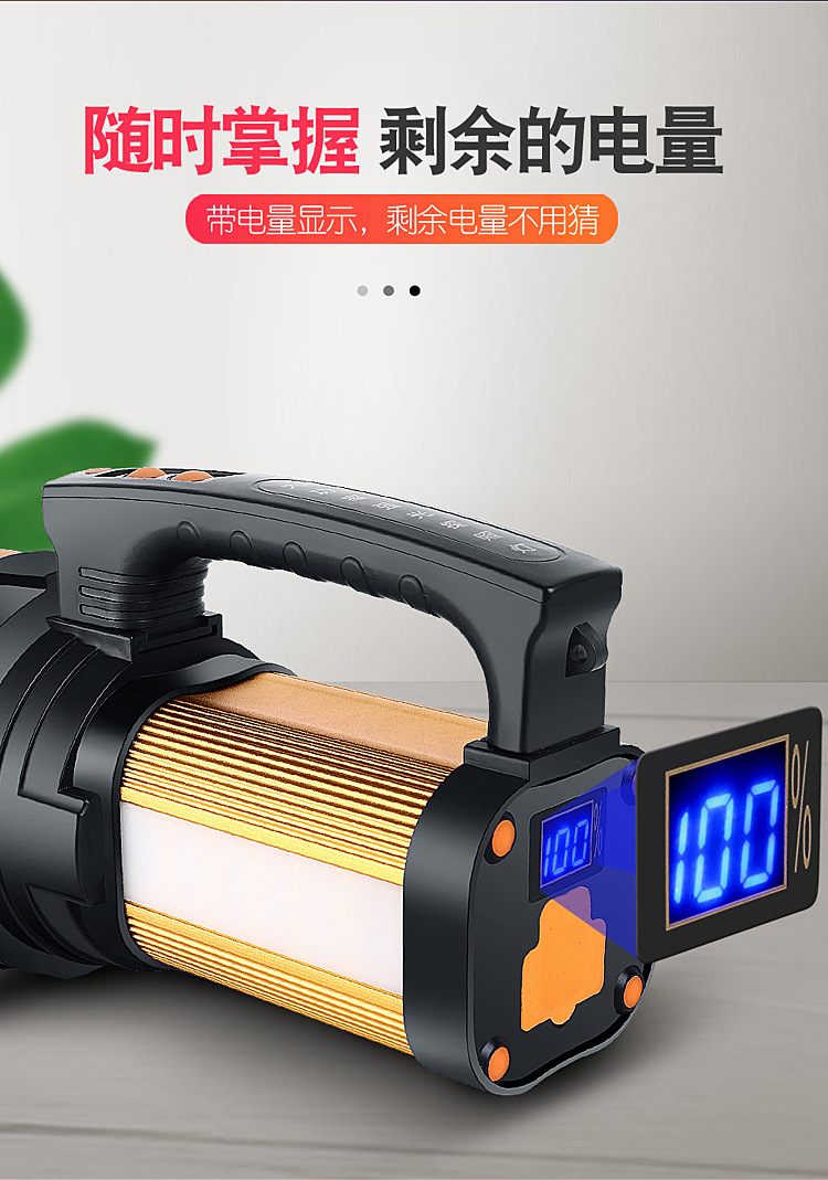 • 측면 조명 + 경고등 + 디지털 디스플레이 + 보조 배터리 기능 포함 - P90 심지 9000 유형 강한 빛 10 약한 빛 60