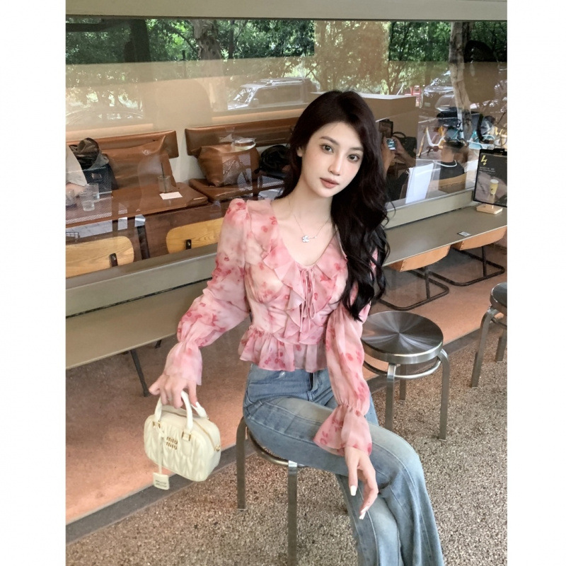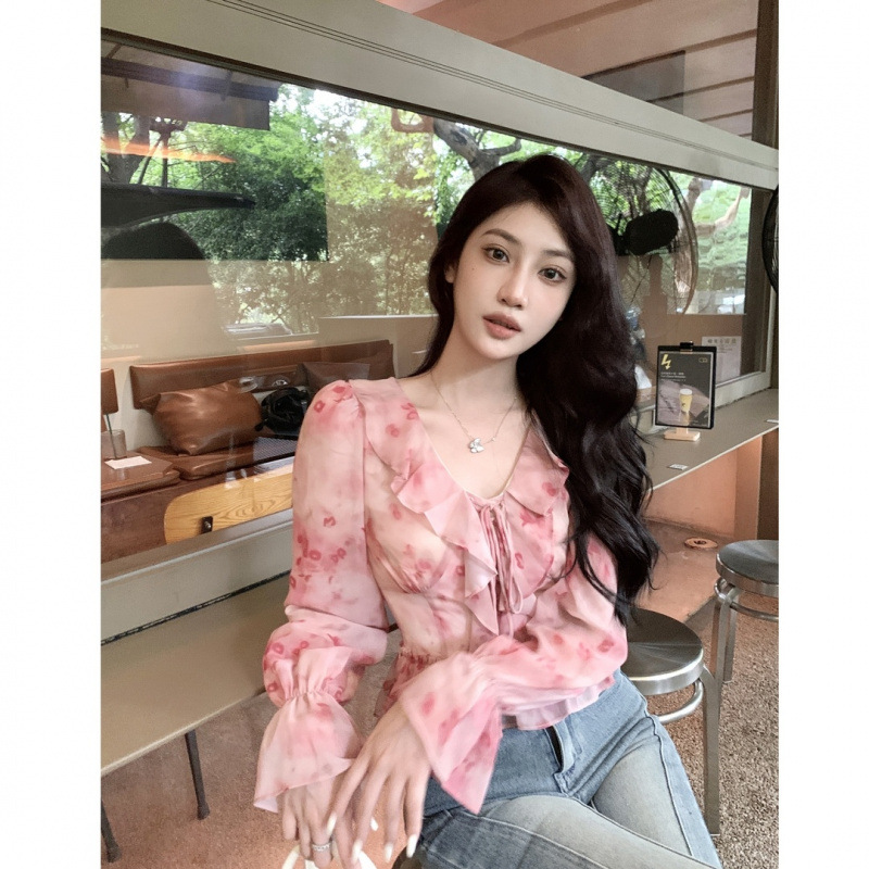러플 플로랄 쉬폰 셔츠 여성용 봄 원피스 2025 새로운 스타일 기질 작은 셔츠 디자인 서양식 시대 감소 탑 느낌