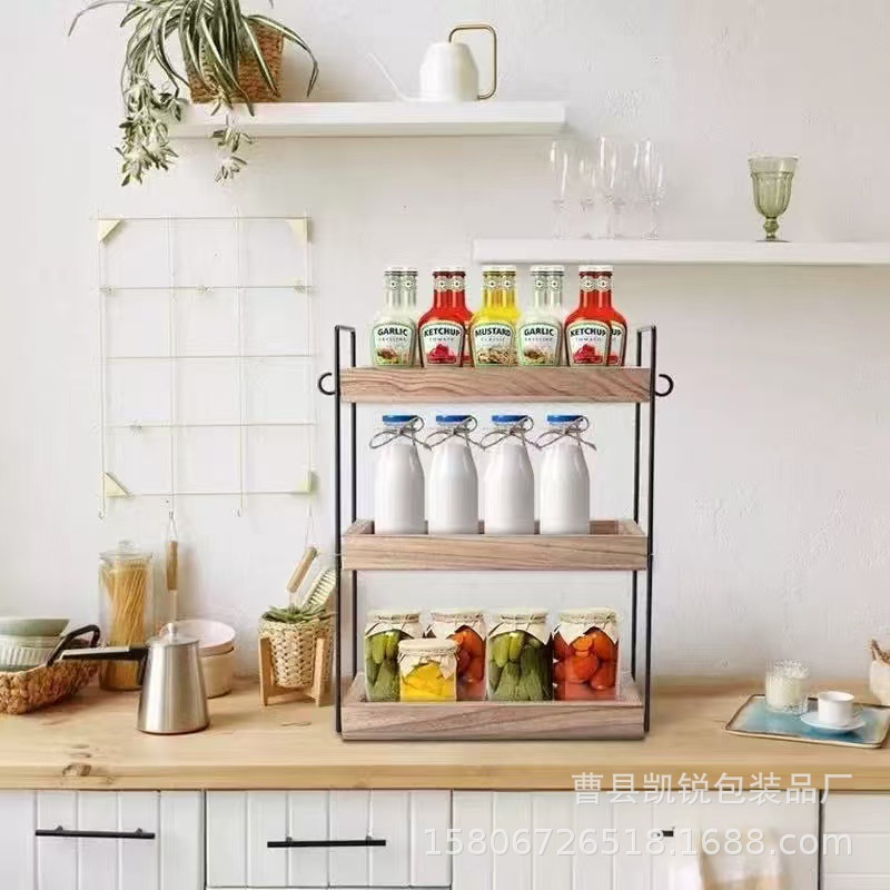 나무 테이블 탑 더블 레이어 저장 랙 철 욕실 가정용 다목적 주방 보관 랙 바닥 테이블 최고 양념 랙스토어 가기