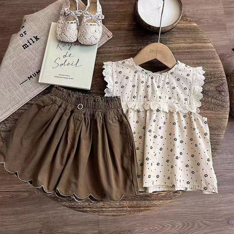 모리 소녀의 여름 세트 2025 새로운 스타일 유행 아기 조끼 어린이 꽃 탑 2 피스 세트