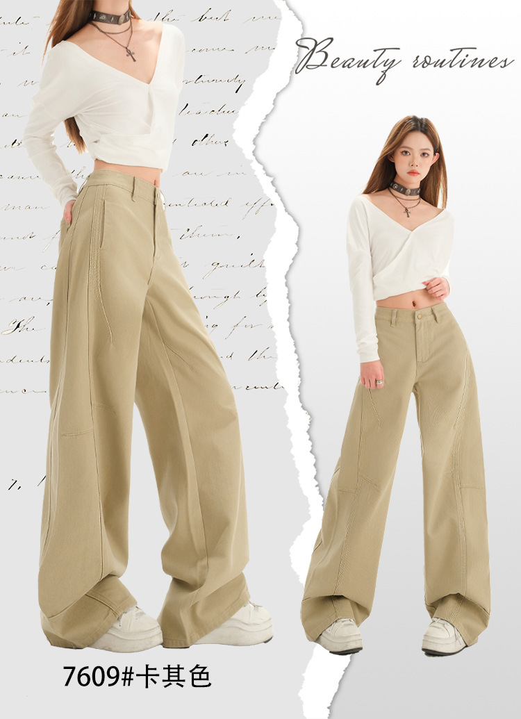 SY7609 새로운 미국 스타일 레트로 청바지 여성 디자인 감각 카키 느슨한 넓은 다리 스트레이트 바지