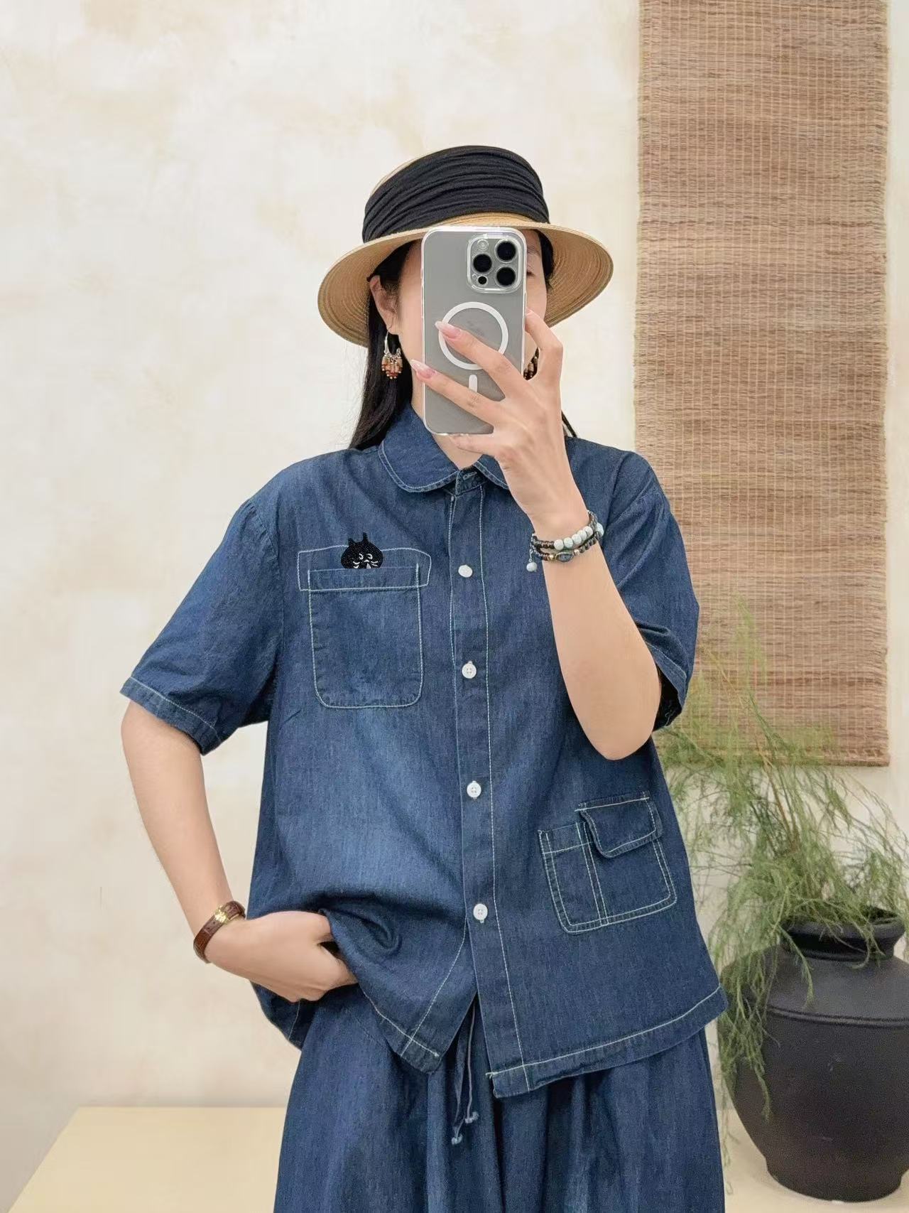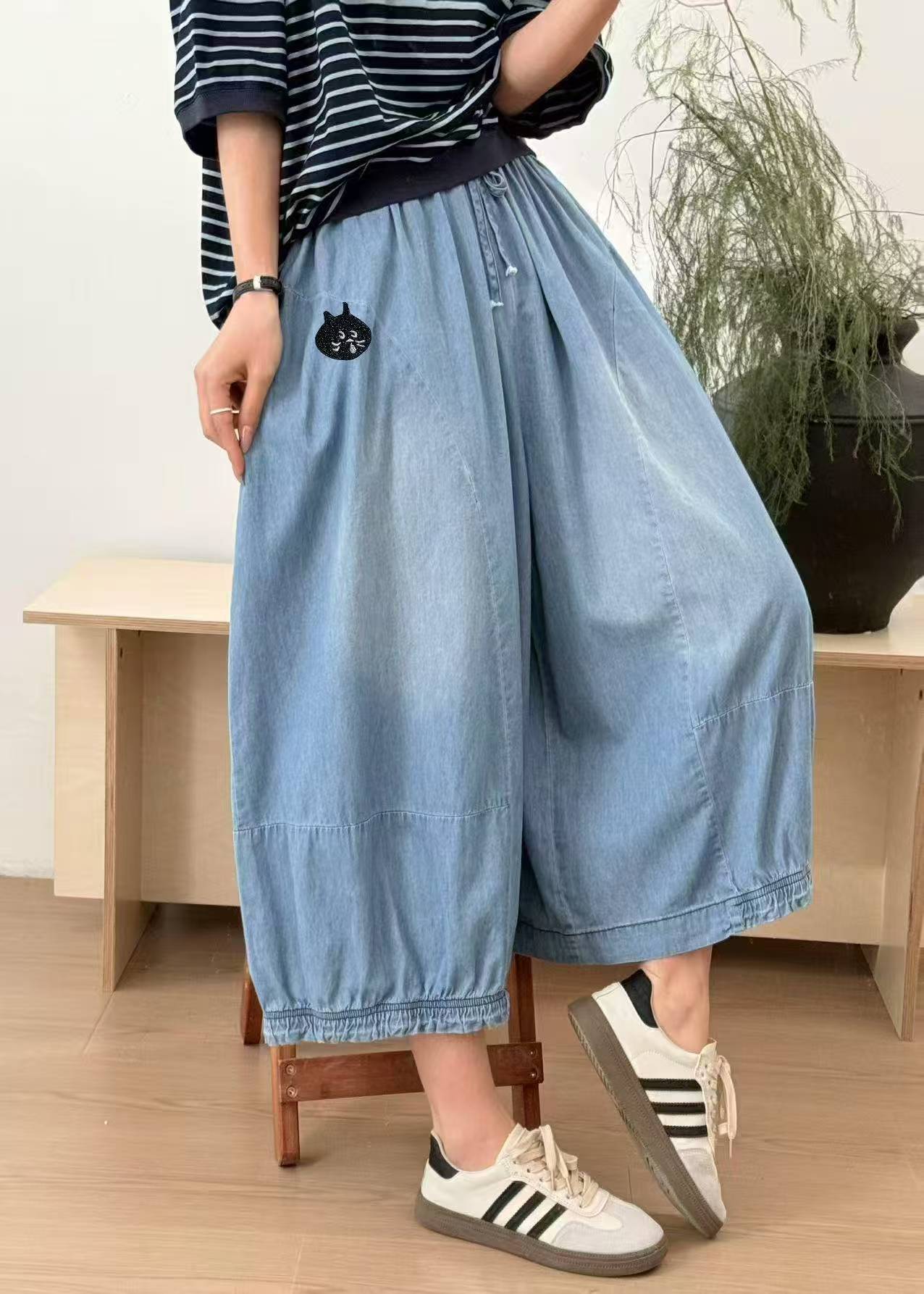 통근 캐주얼 자수 데님 반팔 셔츠 대학 스타일 탑 느슨한 바지 조커 스커트 투피스 여성용 25380
