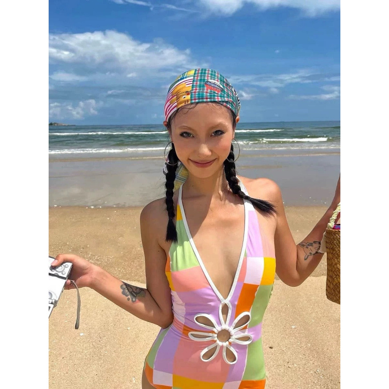 2025 새로운 인터넷 연예인 작은 가슴 끈이없는 섹시 할로우 꽃 목에 매달려있는 여성용 온천 휴가 수영복