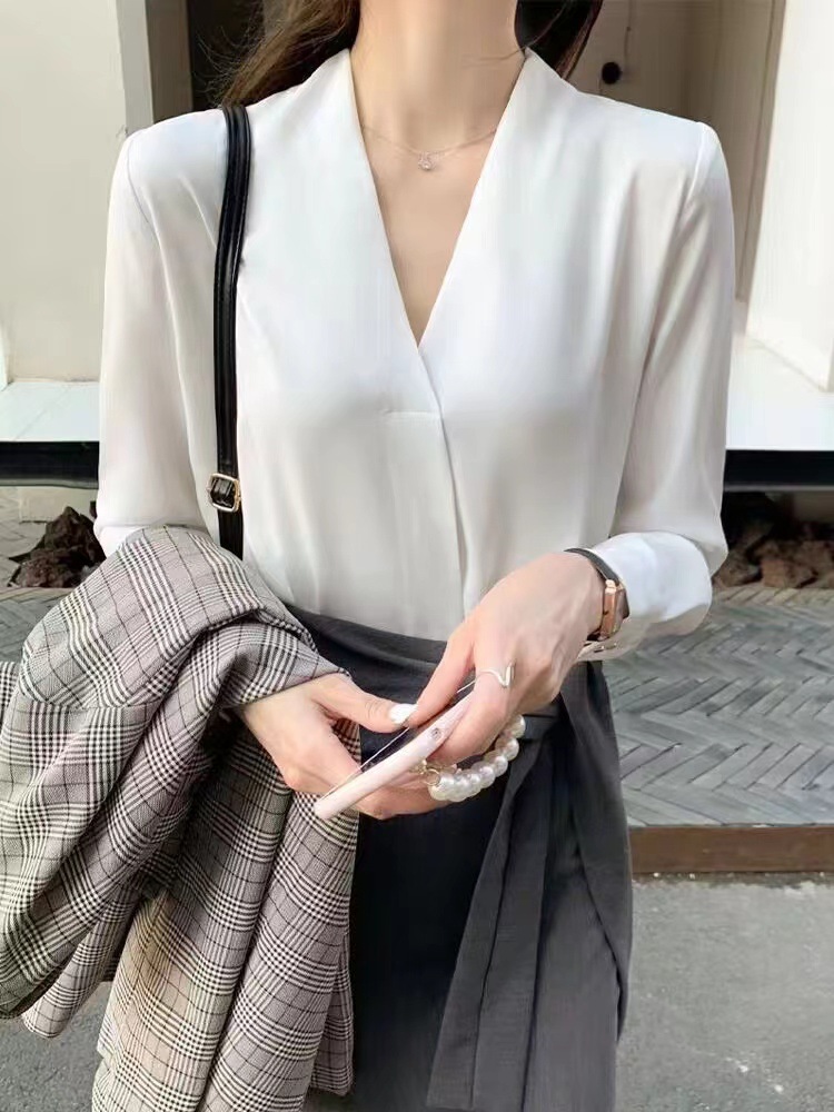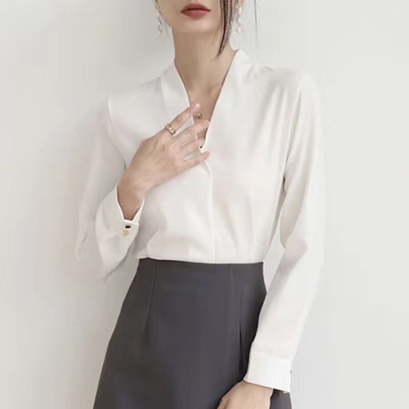 칼라리스 화이트 셔츠 여성용 주름 방지 작업복 최고 가을 하이 엔드 센스 우아한 쉬폰 V 넥 전문 긴팔 셔츠