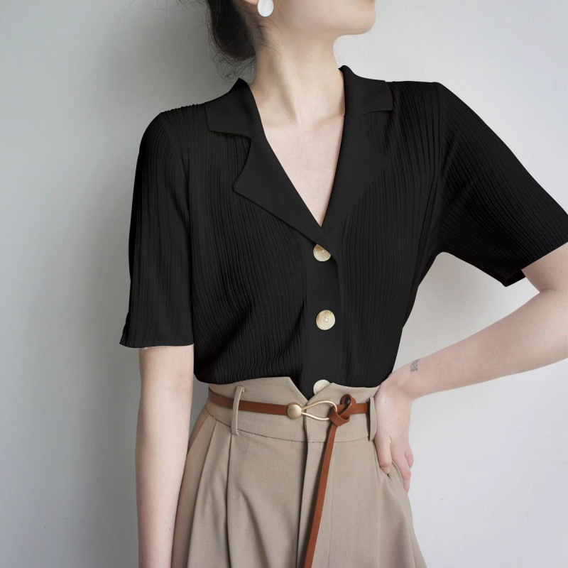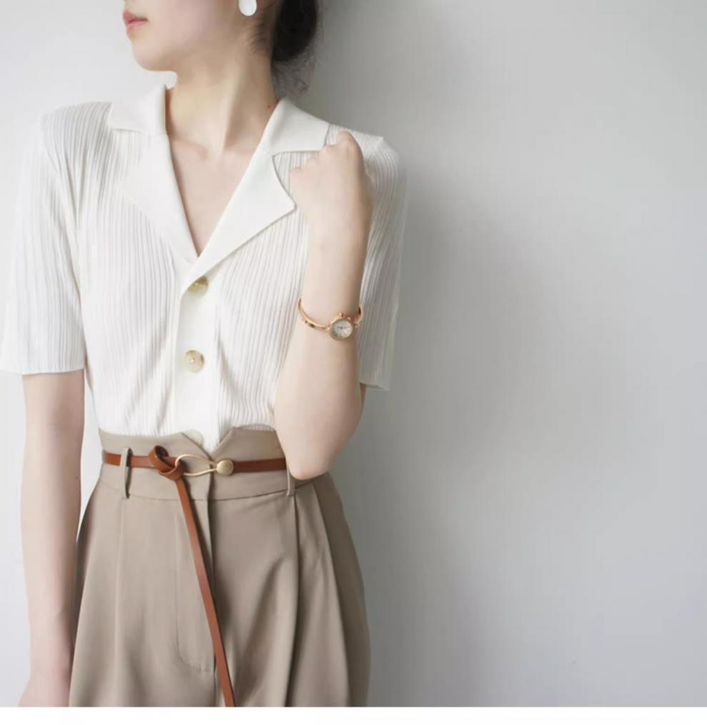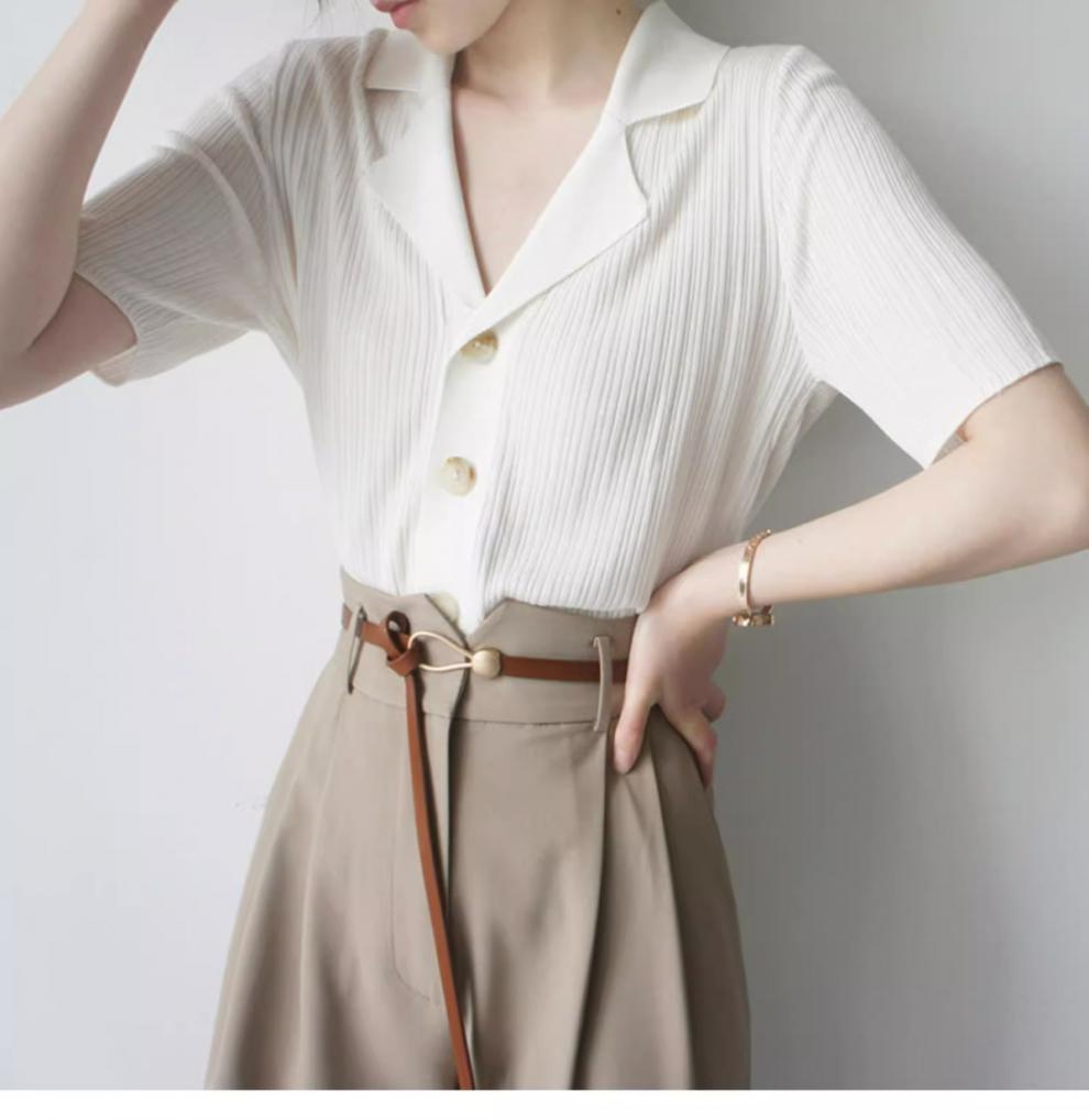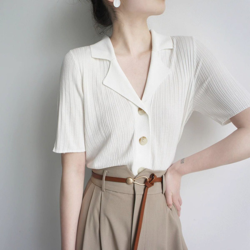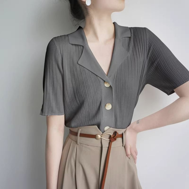 회색 폴로 셔츠 니트 반팔 카디건 얇은 여성용 엘 샤넬 티셔츠 여성용 어깨 티셔츠 탑스토어 가기
