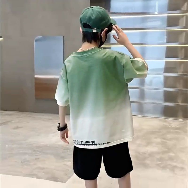 남학생 여름 의류 그라디언트 스포츠 세트 2025 새로운 큰 소년 한국 러피 잘 생긴 재킷 티셔츠 바지 투피스 세트