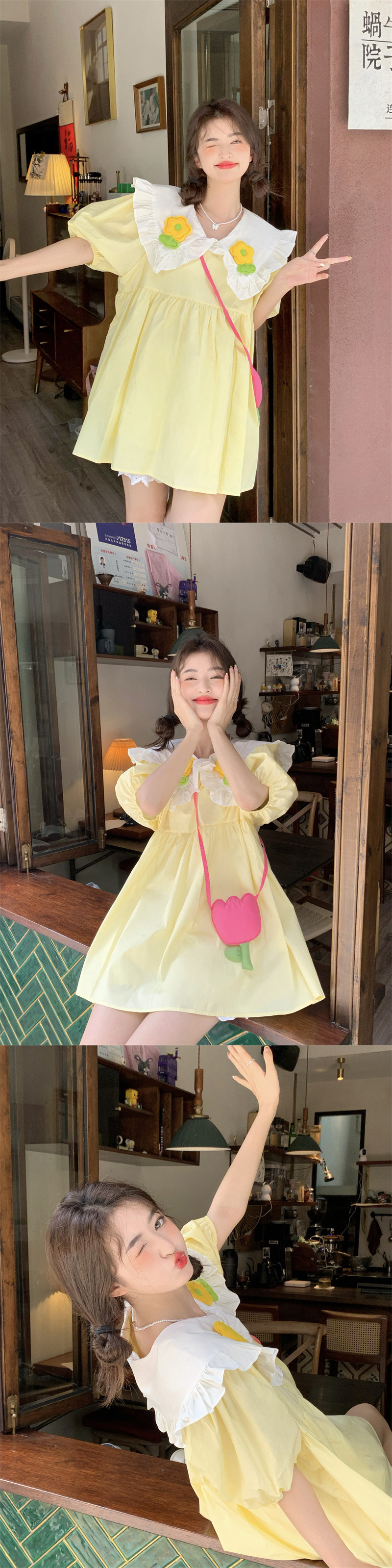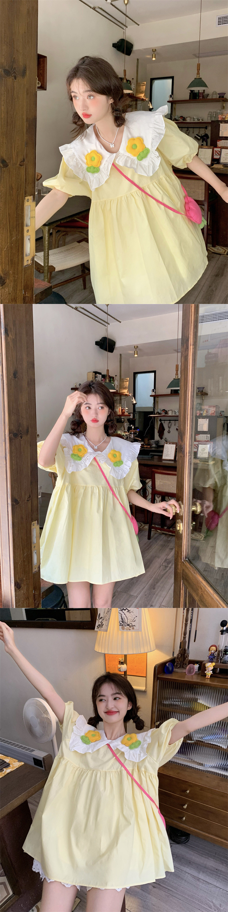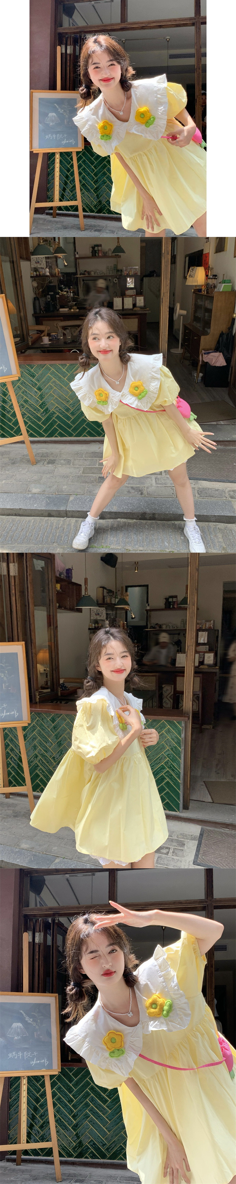 신선한 3 차원 꽃 대비 컬러 인형 칼라 원피스 여성 여름 2025 새로운 느슨한 나이 감소 A 라인 스커트스토어 가기