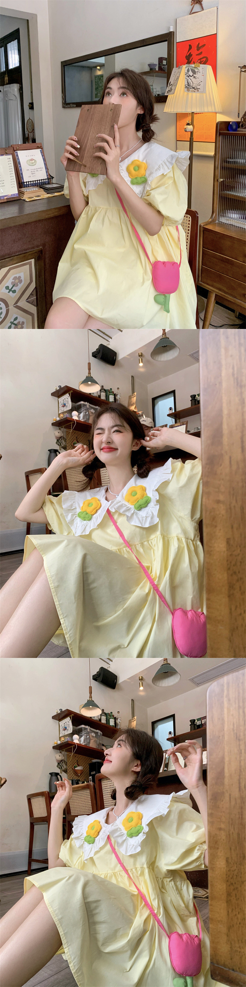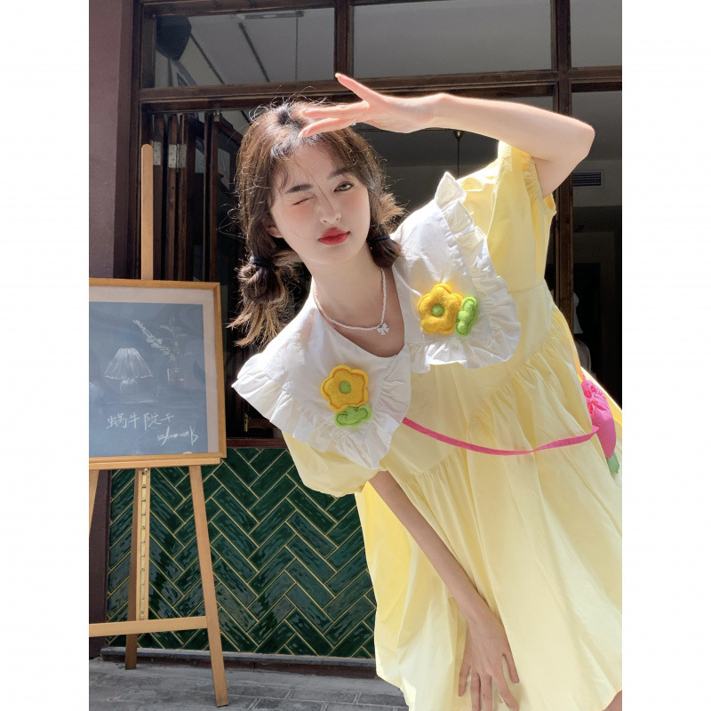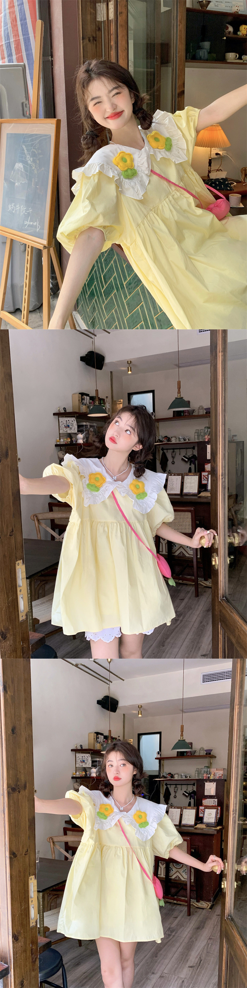 신선한 3 차원 꽃 대비 컬러 인형 칼라 원피스 여성 여름 2025 새로운 느슨한 나이 감소 A 라인 스커트스토어 가기