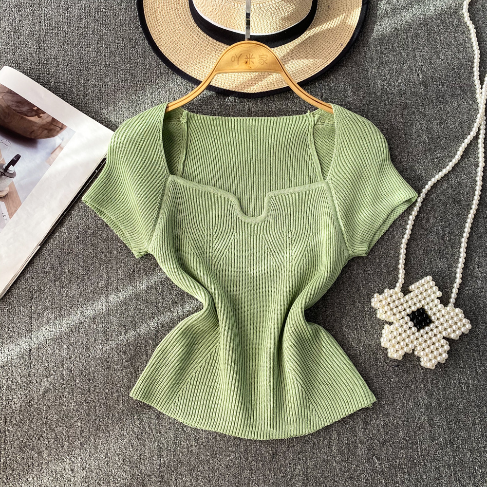 여름 스파이스 소녀 스타일 짧은 티셔츠 반팔 디자인 센스 니쉬 스퀘어 칼라 넥 니트 탑 여성