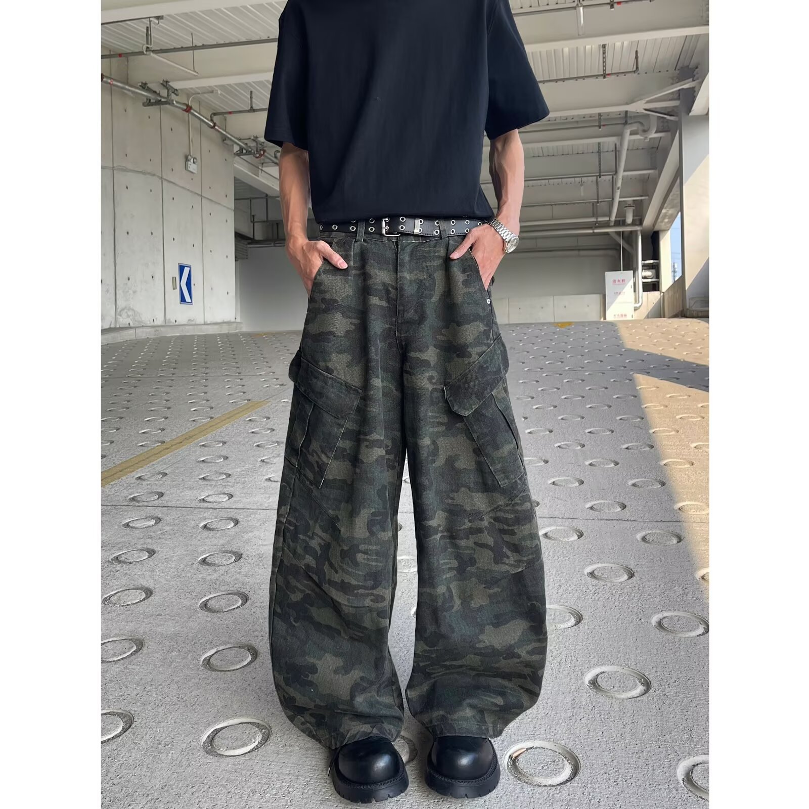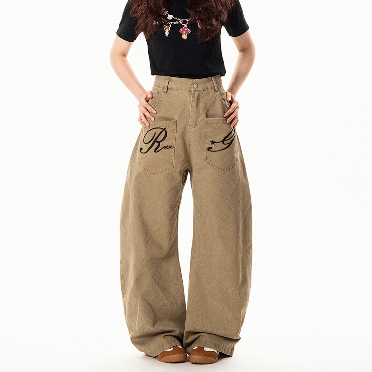 아메리칸 스타일 레트로 대형 포켓 마체테 청바지 여성의 봄과 가을 뜨거운 소녀 하이 스트리트 디자인 느슨한 넓은 다리 바지