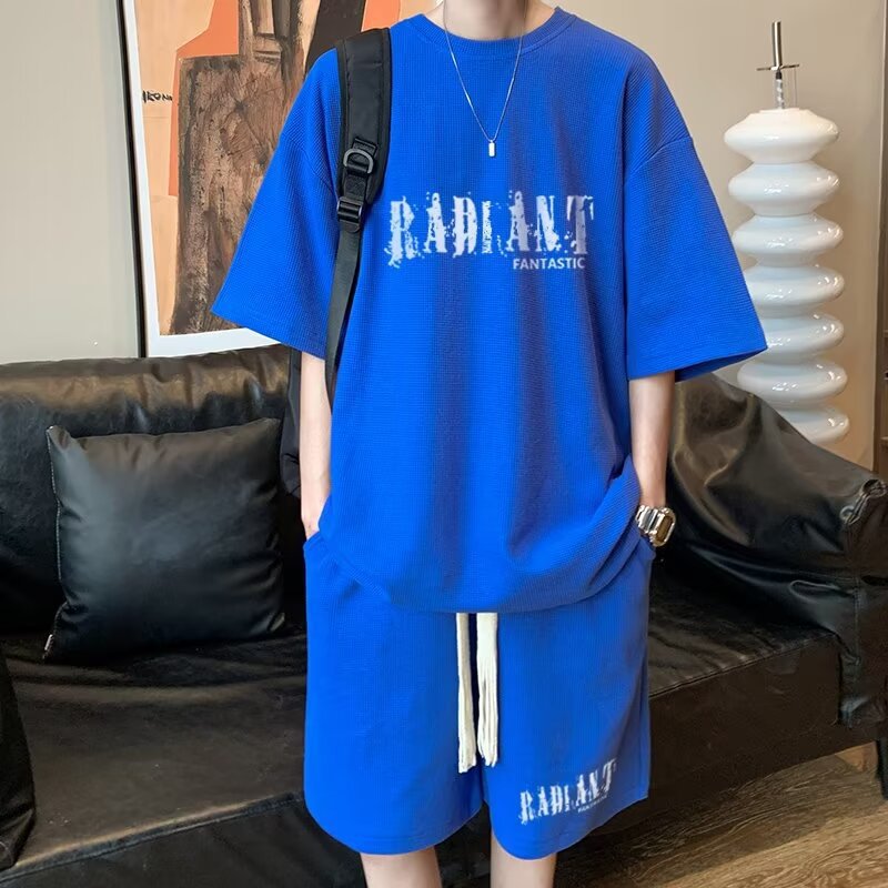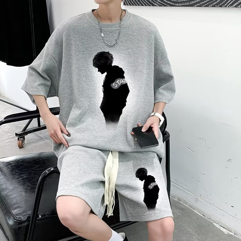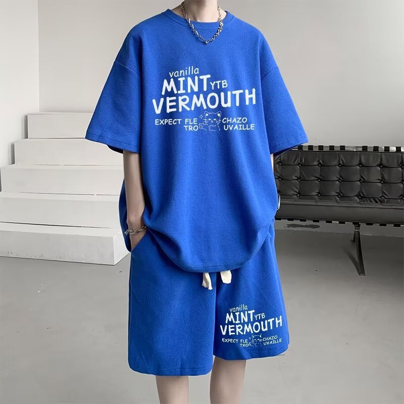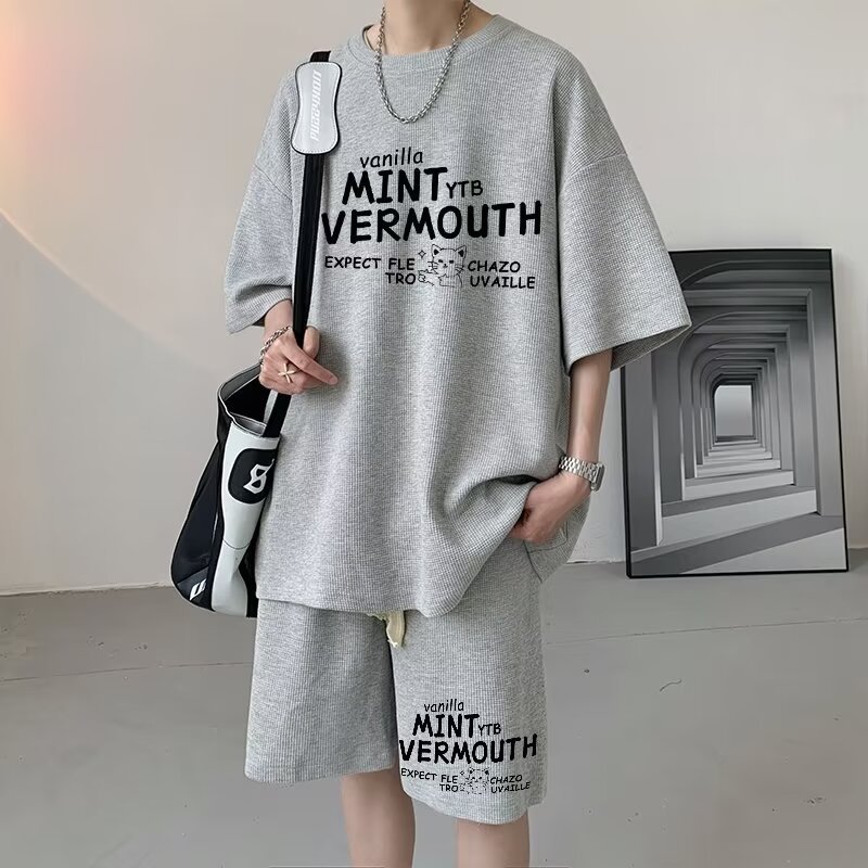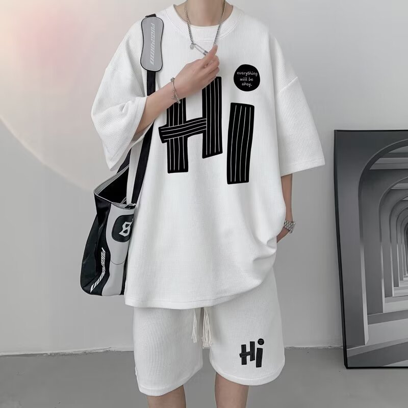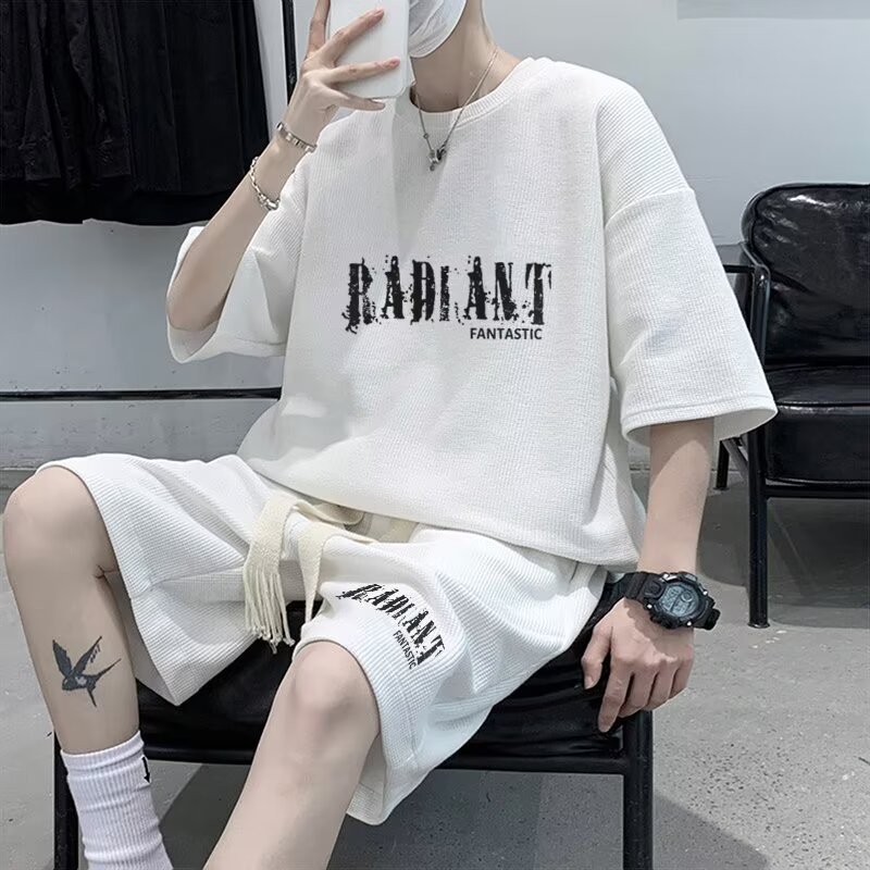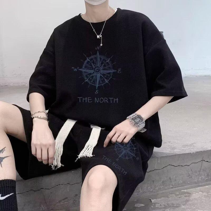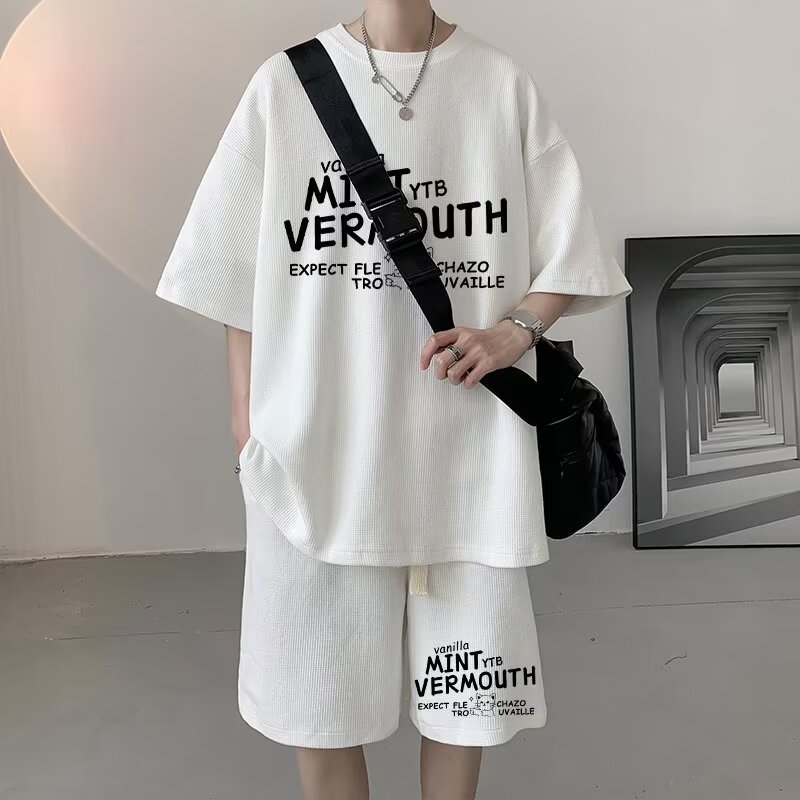 여름 와플 스포츠 세트 남성용 오버 사이즈 잘 생긴 티셔츠 반바지 투피스 트렌디 남성용 패션복