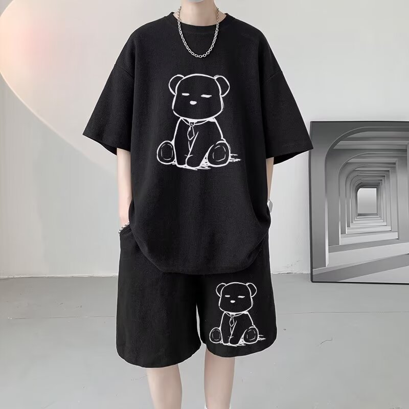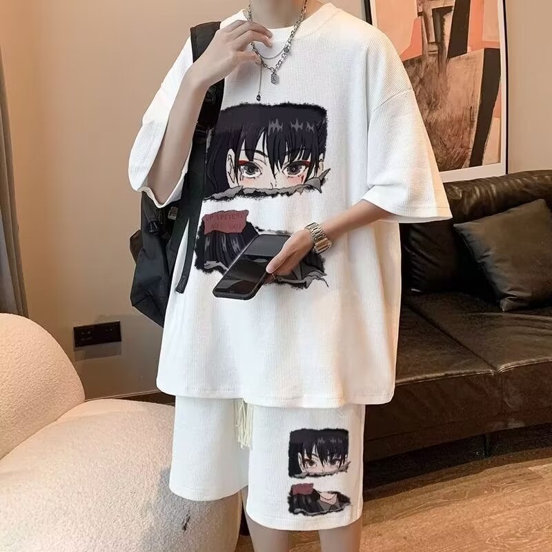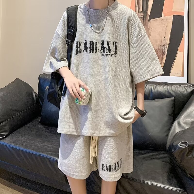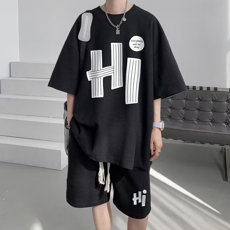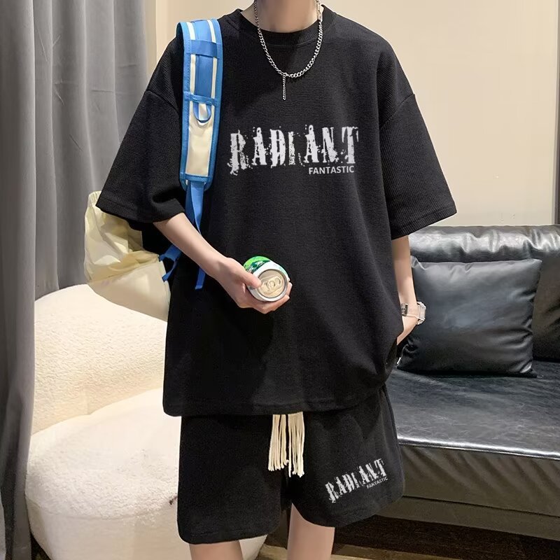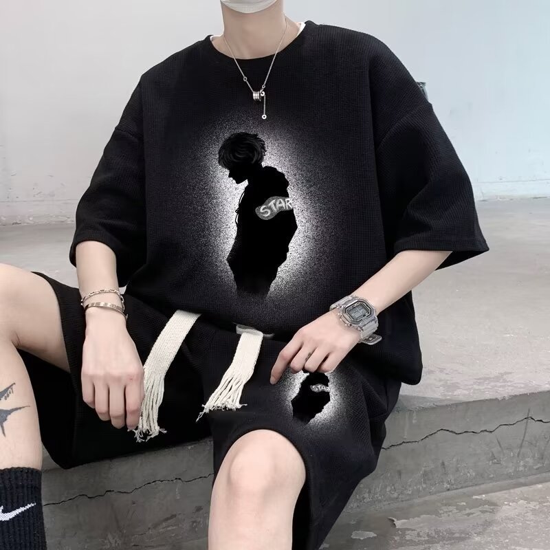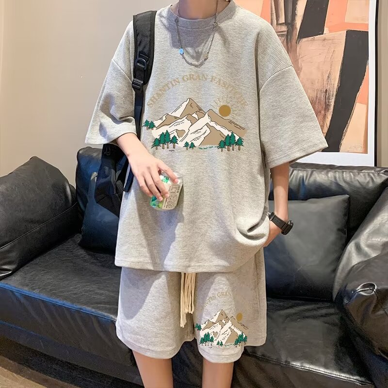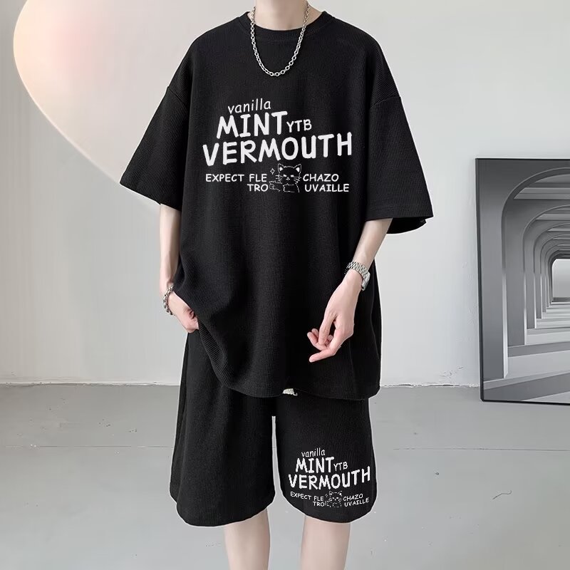 여름 와플 스포츠 세트 남성용 오버 사이즈 잘 생긴 티셔츠 반바지 투피스 트렌디 남성용 패션복