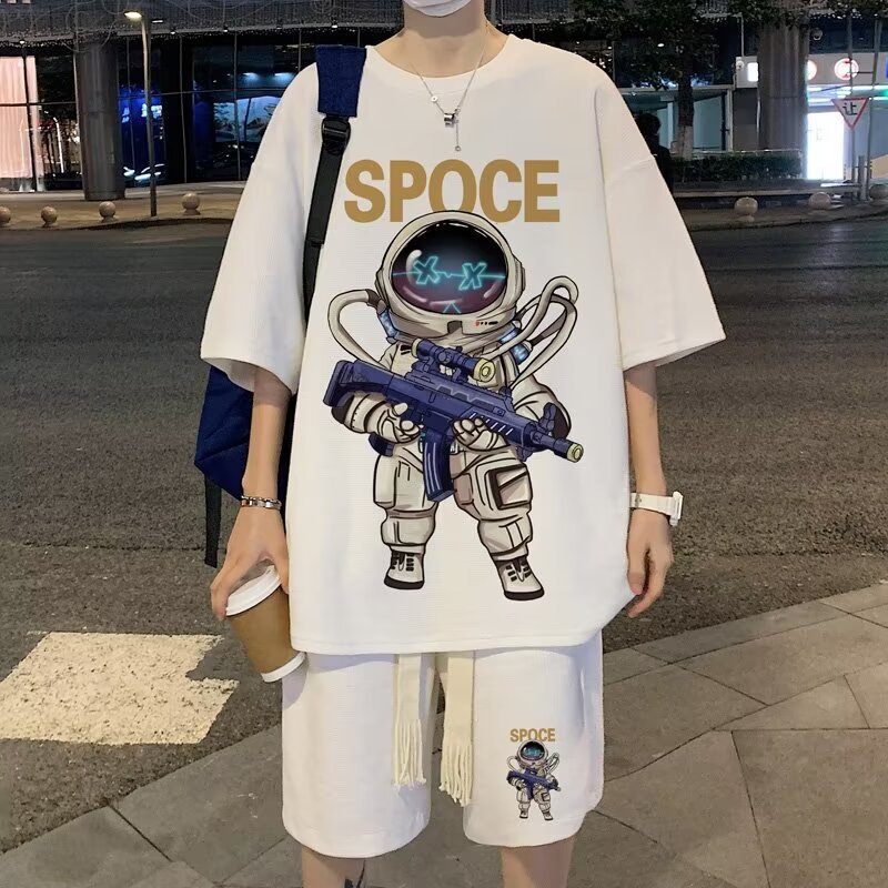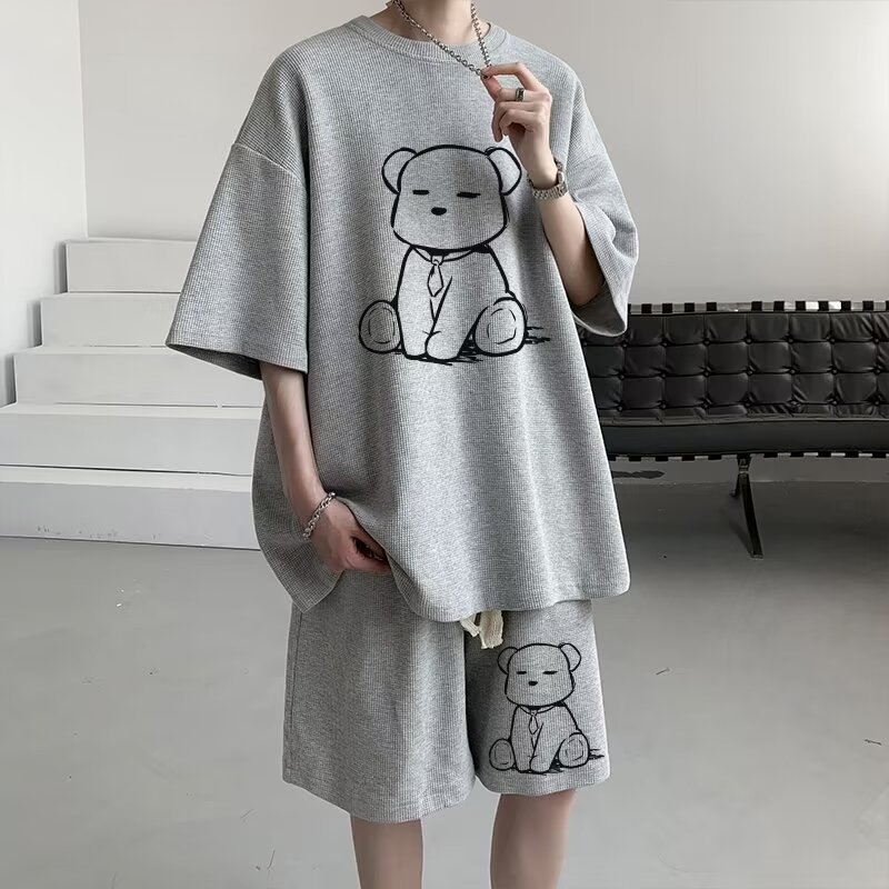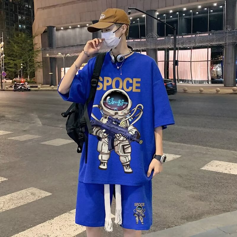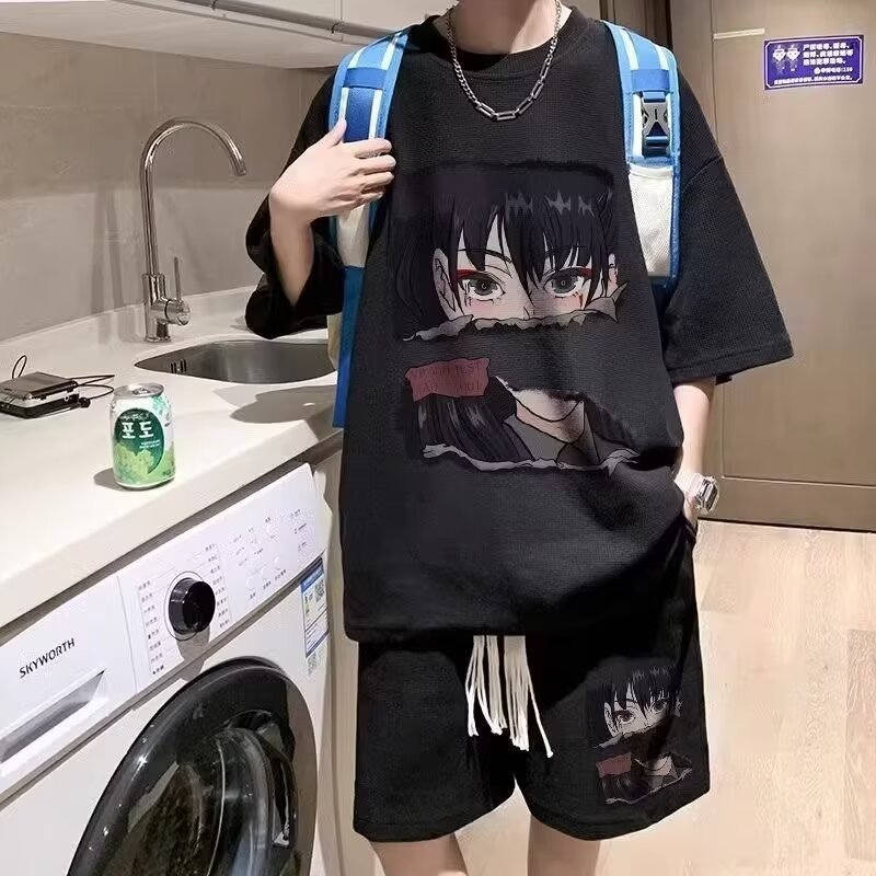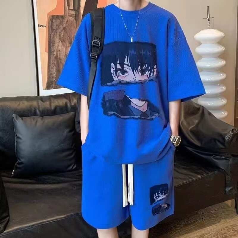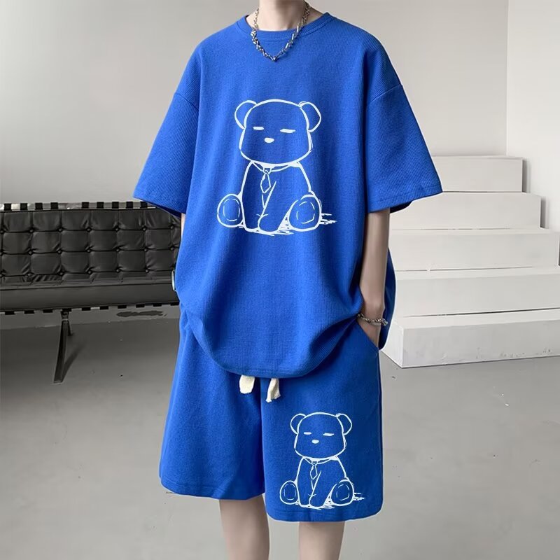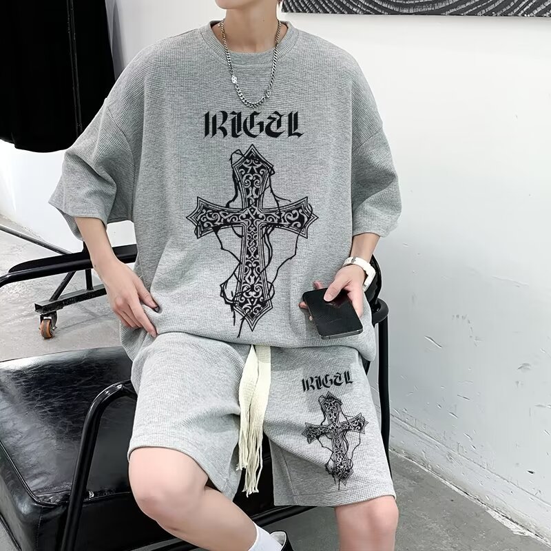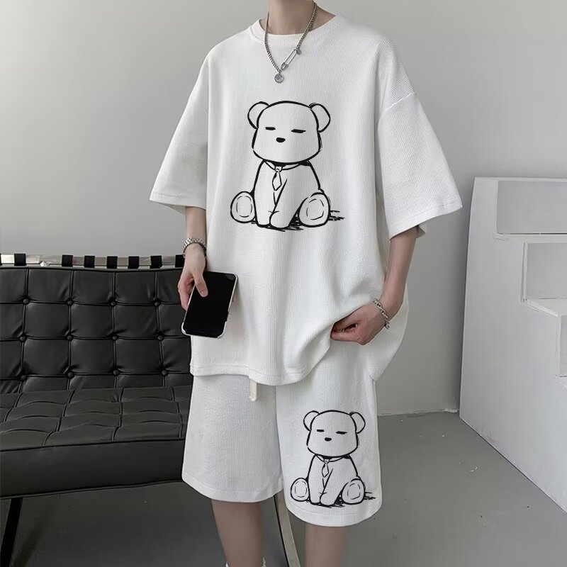 여름 와플 스포츠 세트 남성용 오버 사이즈 잘 생긴 티셔츠 반바지 투피스 트렌디 남성용 패션복