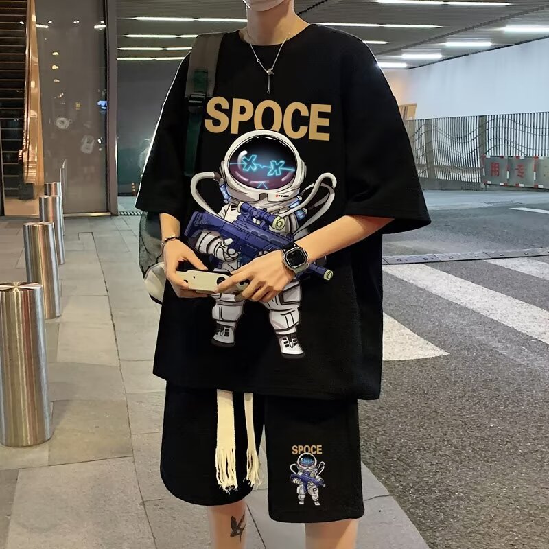 여름 와플 스포츠 세트 남성용 오버 사이즈 잘 생긴 티셔츠 반바지 투피스 트렌디 남성용 패션복스토어 가기