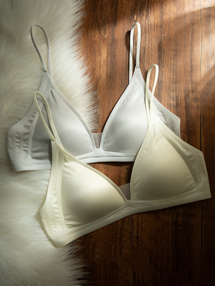 CynL 밀크 새틴 프렌치 스타일 딥 V 넥 속옷 여성 여름 얇은 어깨 끈 비 마킹 트라이앵글 컵 작은 가슴 비 림리스 얇은 브래지어