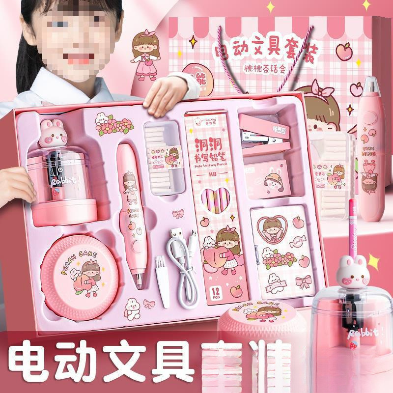 소녀와 소년을위한 전기 문구 세트 선물 상자 1 학년 및 3 학년 초등학생 선물 가방 실용적인 연필 깎기스토어 가기