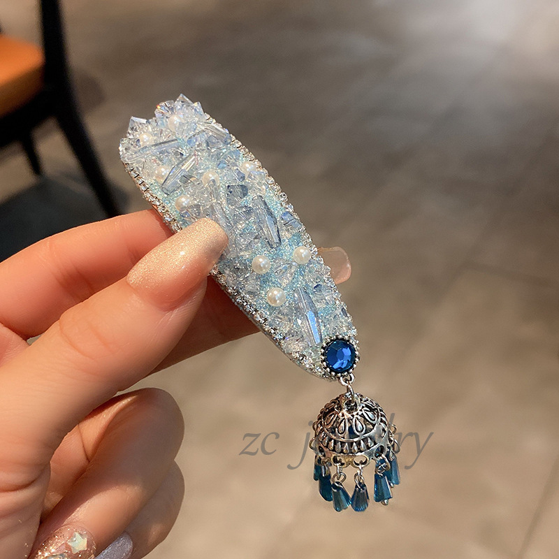 보석 블루 ~ 치유 플래시 다이아몬드 진주 유명한 민족 스타일 프린지 가장자리 클립 여성 성격 우아한 머리핀 헤어 액세서리