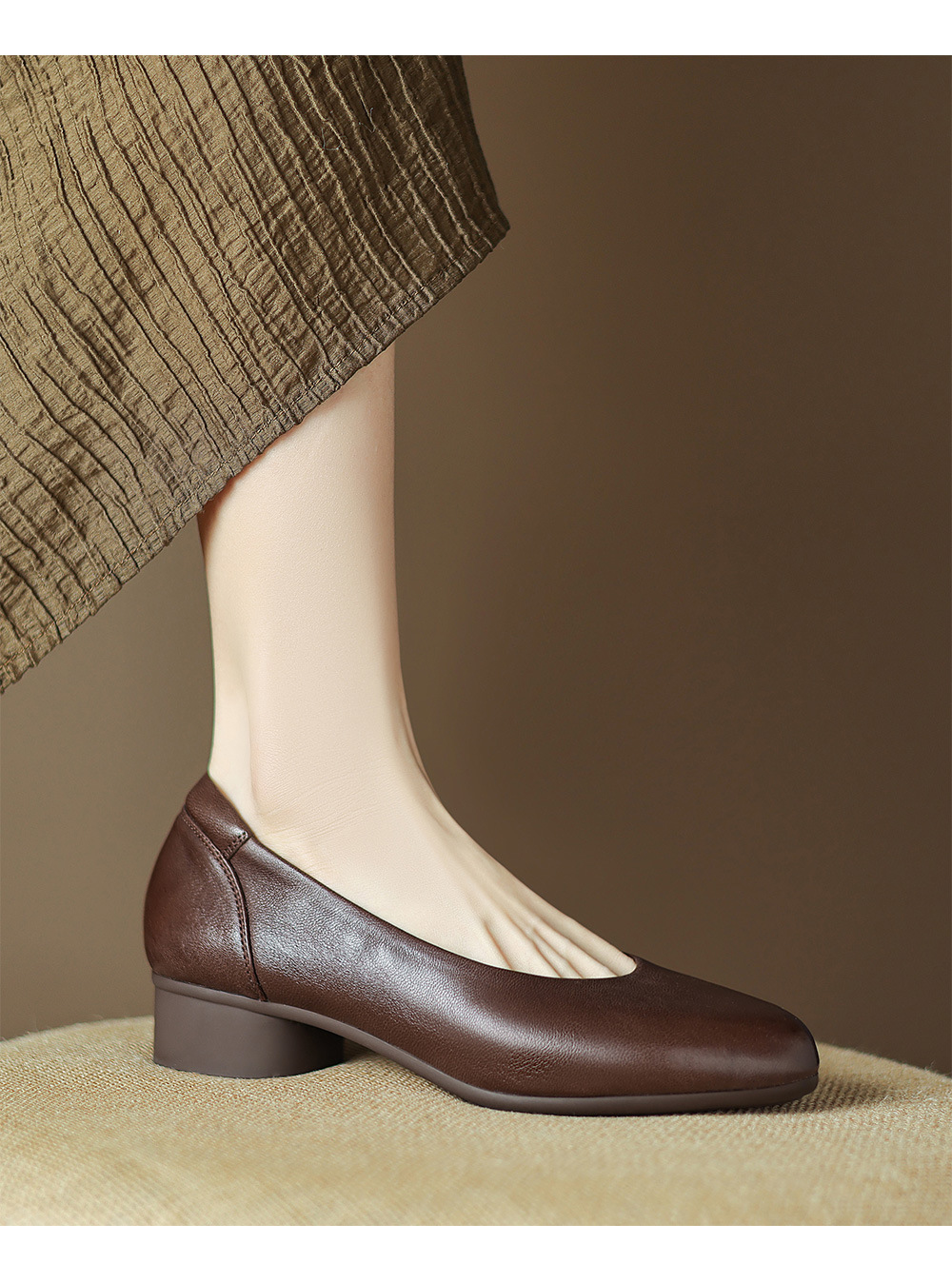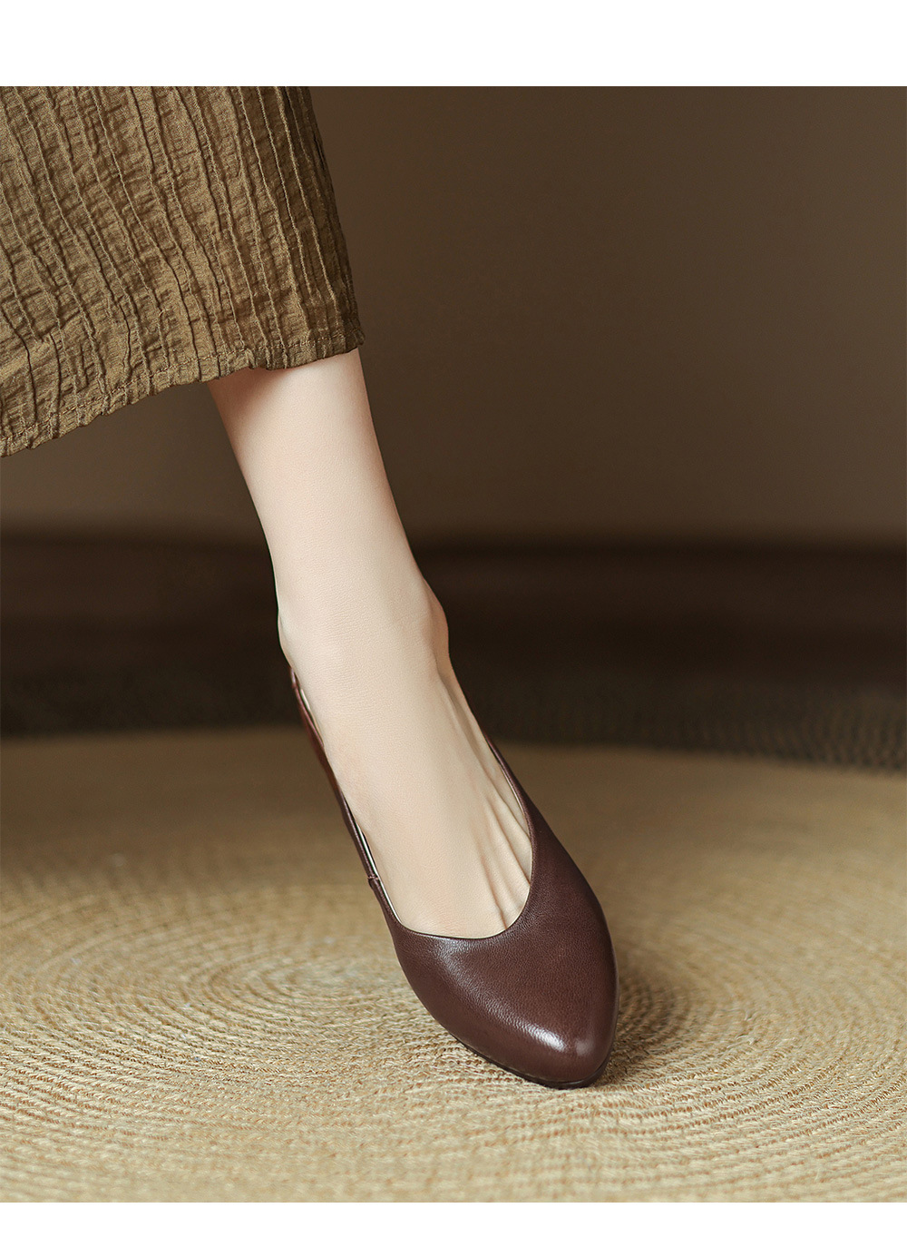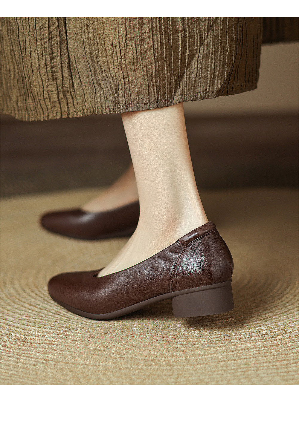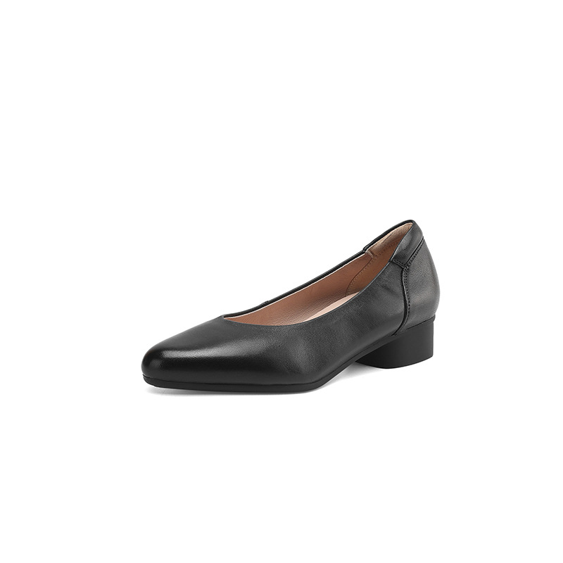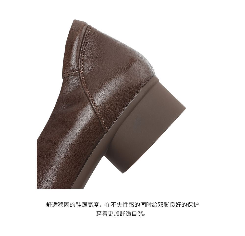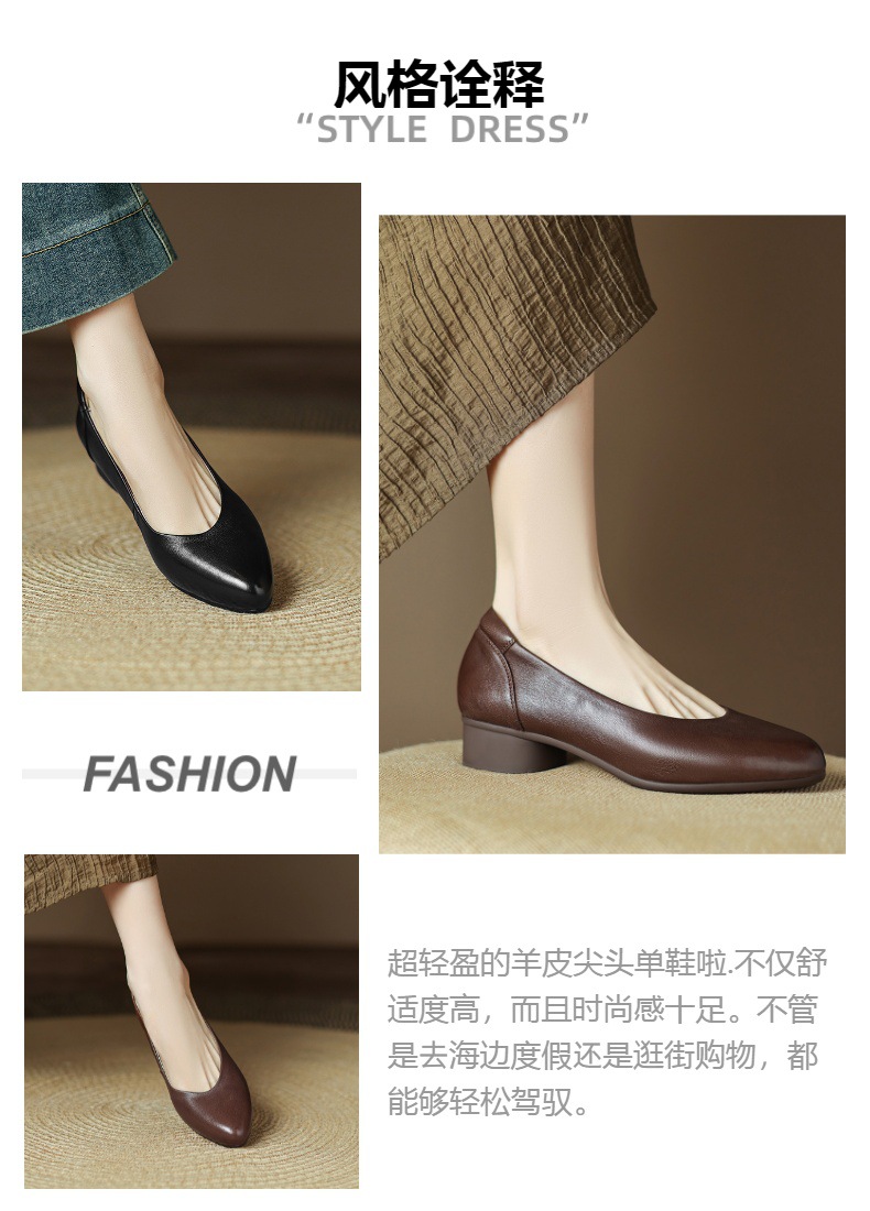 2025 봄 빛 럭셔리 양가죽 밀크 신발 뾰족한 두꺼운 힐 미드 힐 싱글 레이어 신발 레트로 여성용 우아한 올매치 하이힐스토어 가기