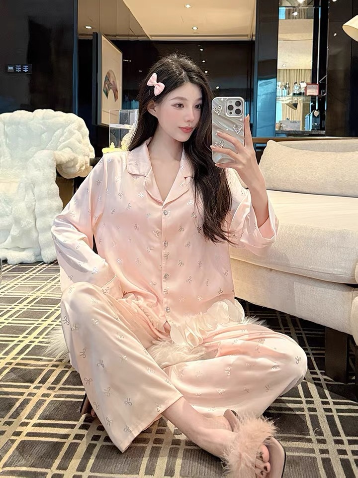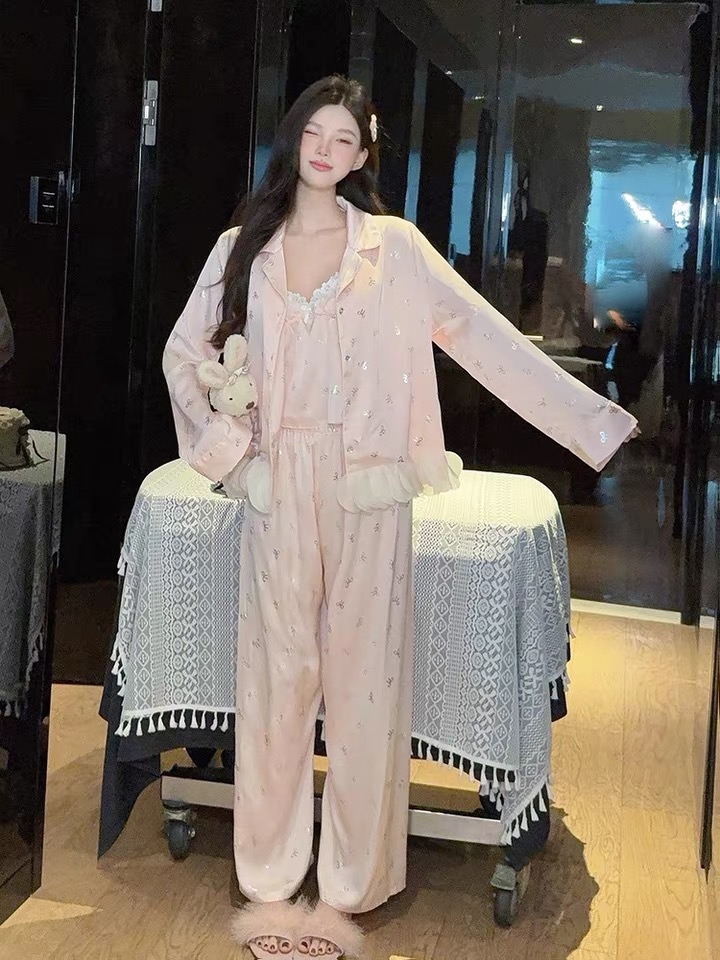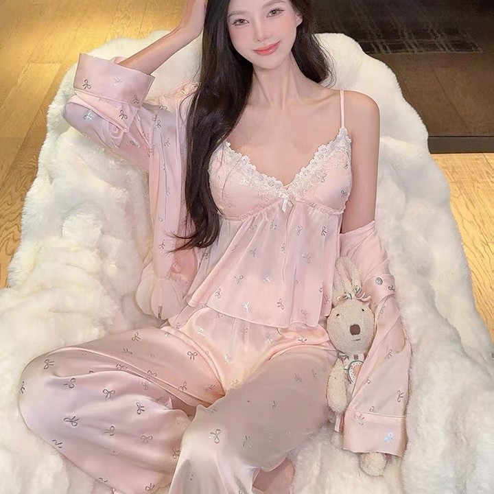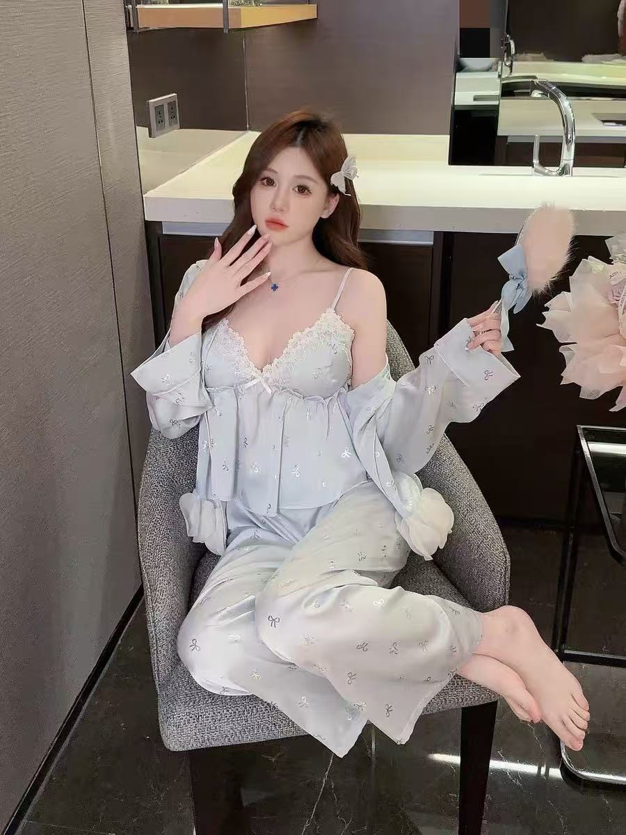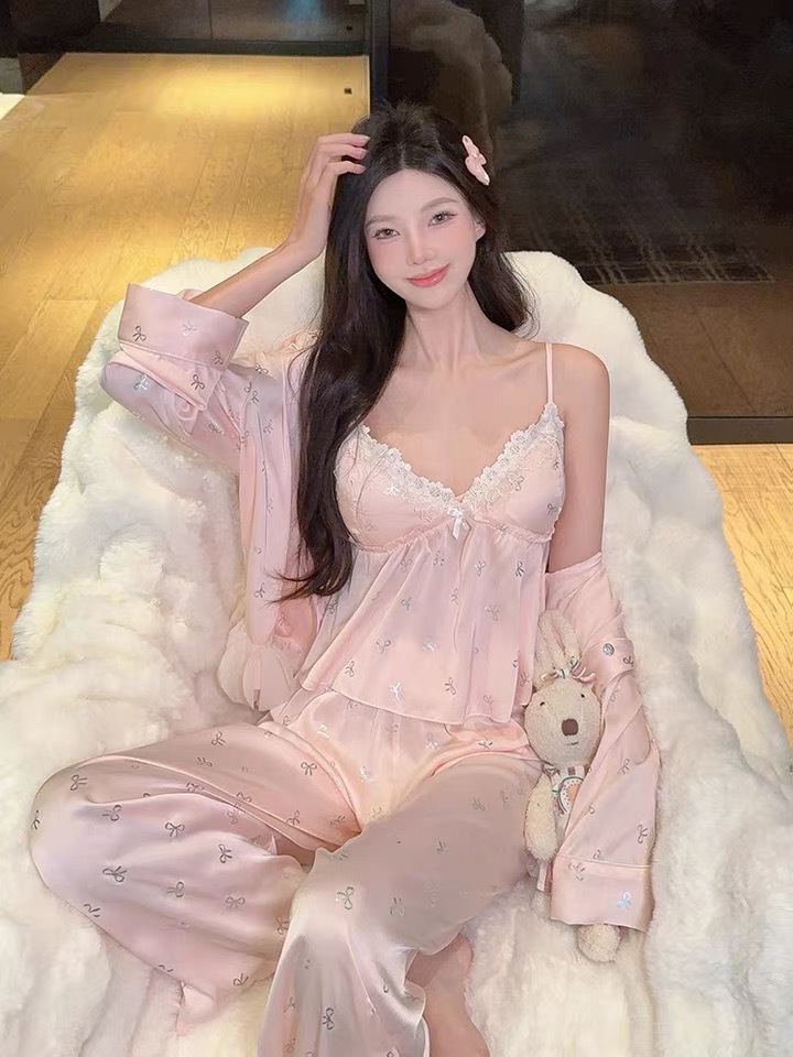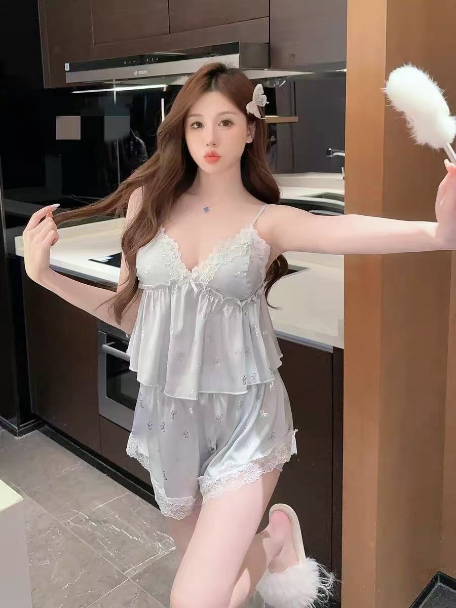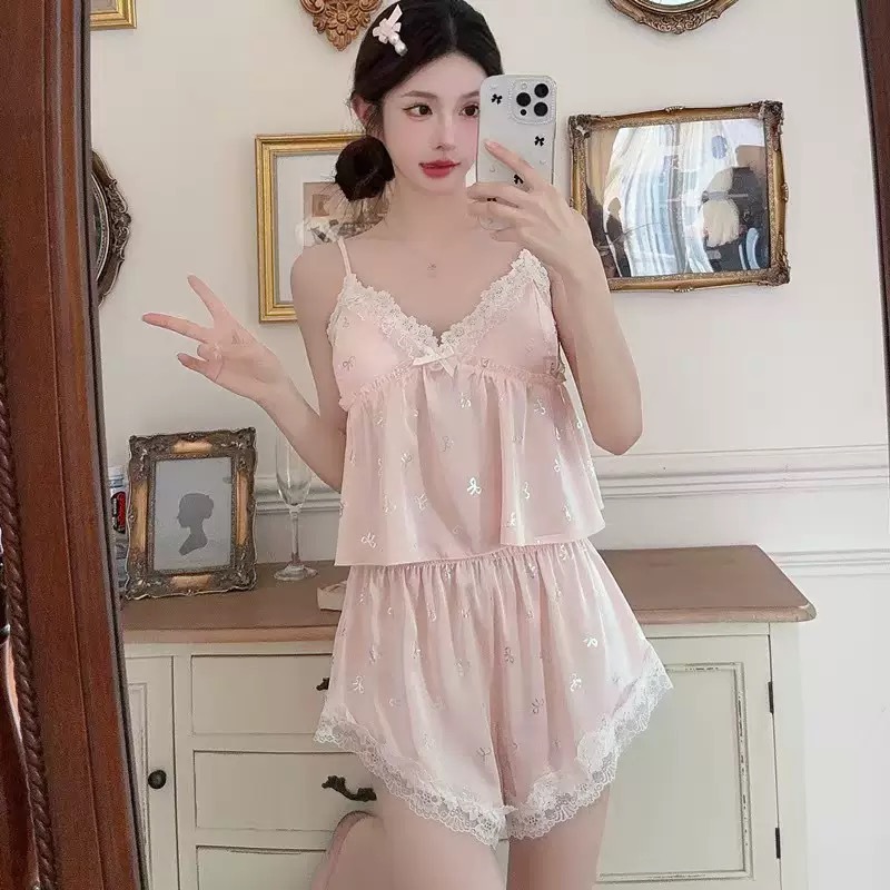 잠옷 여성 2025 년 새 봄과 가을 여름 슬링 아이스 실크 핫 실버 활 가슴 패드 레이스 홈 의류 세트스토어 가기