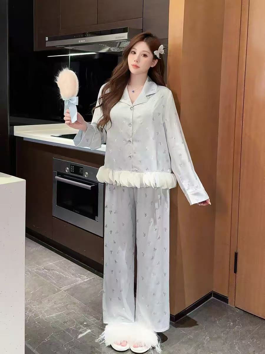 잠옷 여성 2025 년 새 봄과 가을 여름 슬링 아이스 실크 핫 실버 활 가슴 패드 레이스 홈 의류 세트