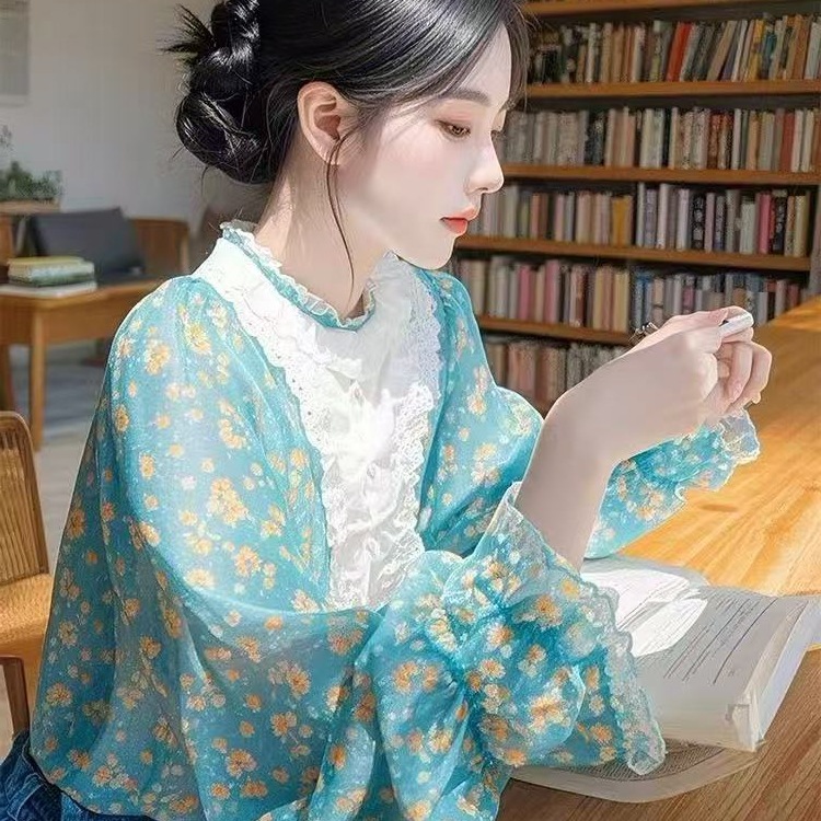 2025 봄 새로운 프랑스 달콤한 빛 성숙한 셔츠 슈퍼 좋은 독특한 아름다운 푸른 꽃 퍼프 소매 셔츠스토어 가기