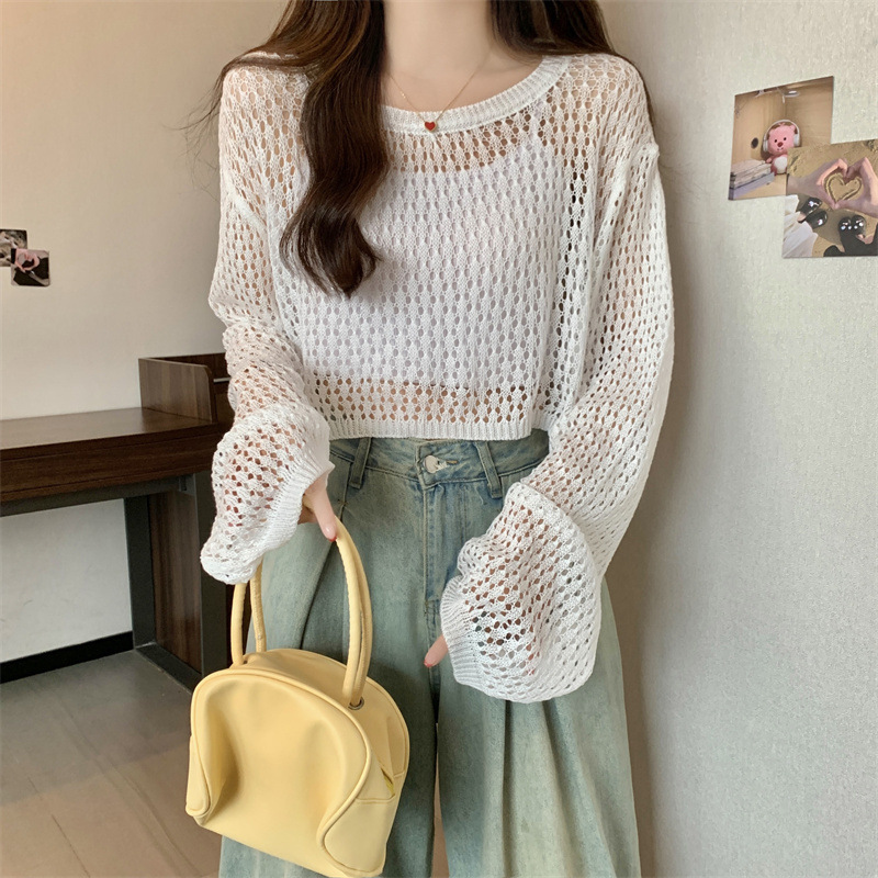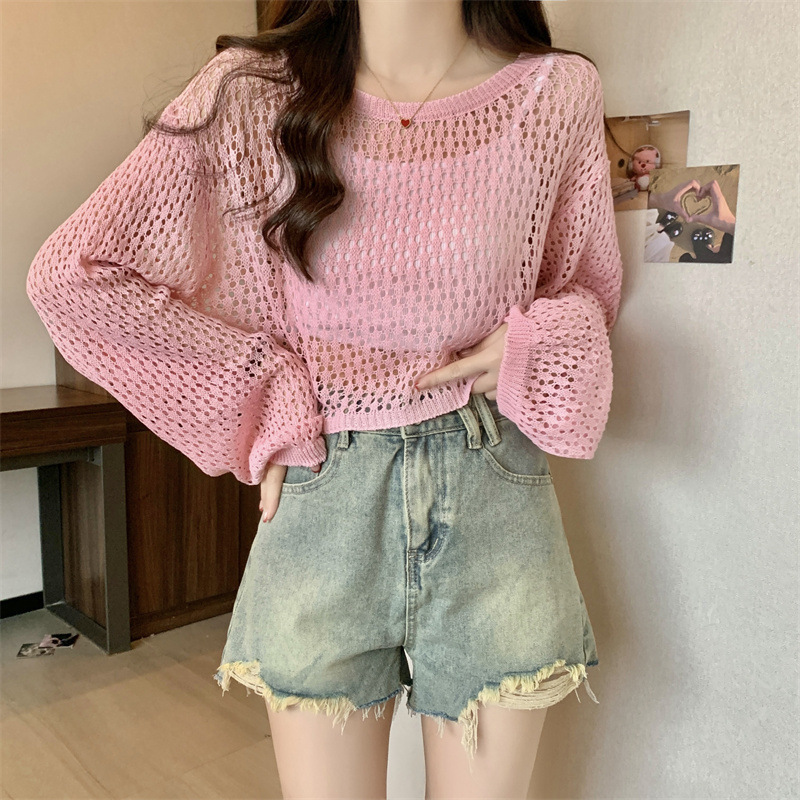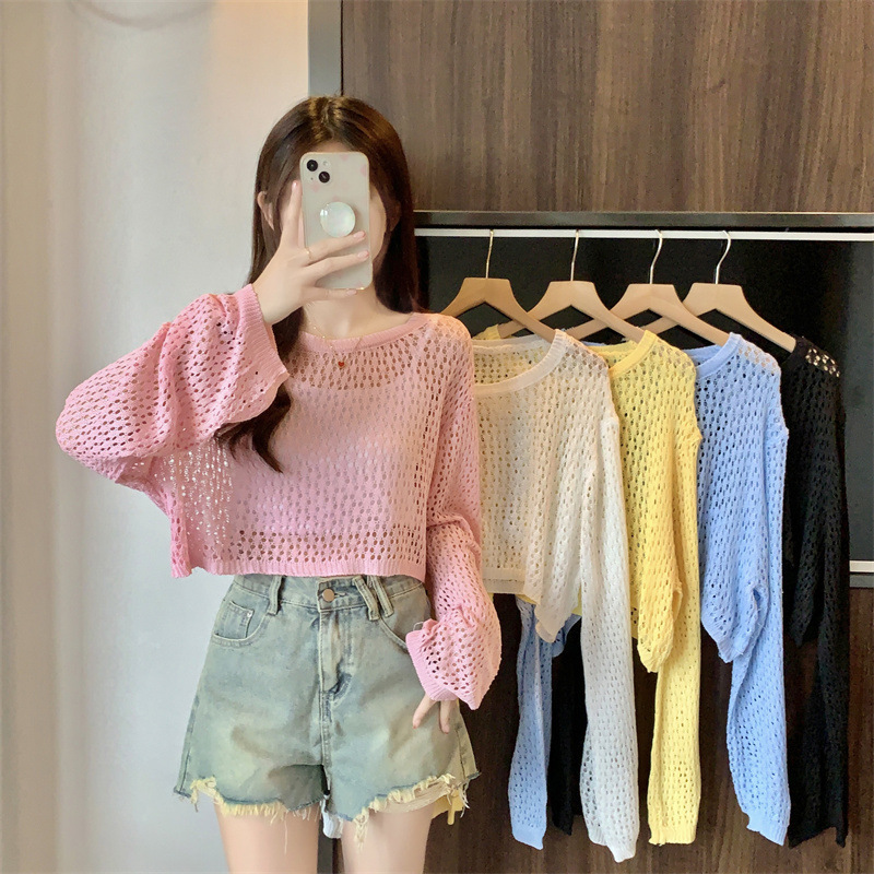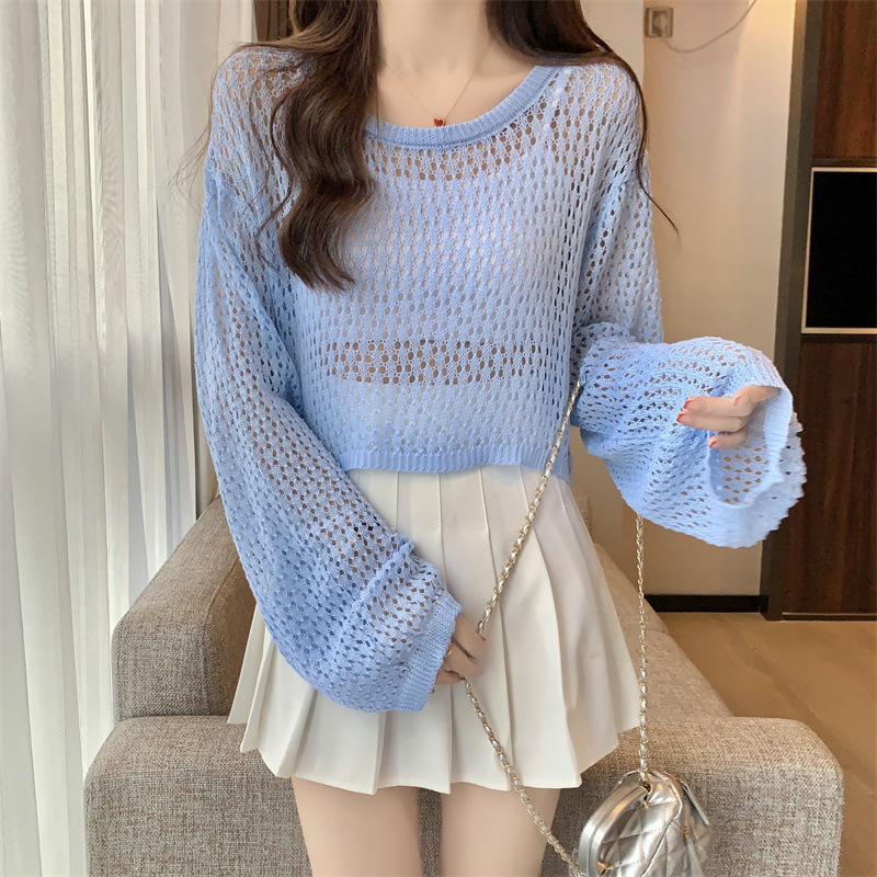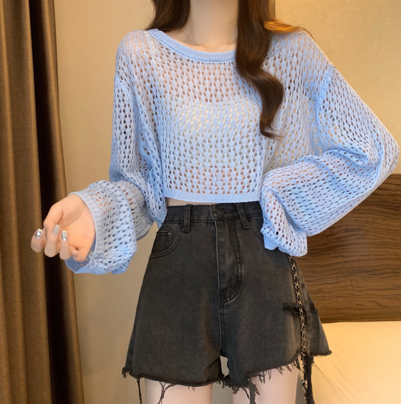 느슨한 랜턴 소매 짧은 빈 블라우스 여성의 여름 Tulle 메쉬 캔디 컬러 달콤한 라운드 넥 긴 소매 스웨터