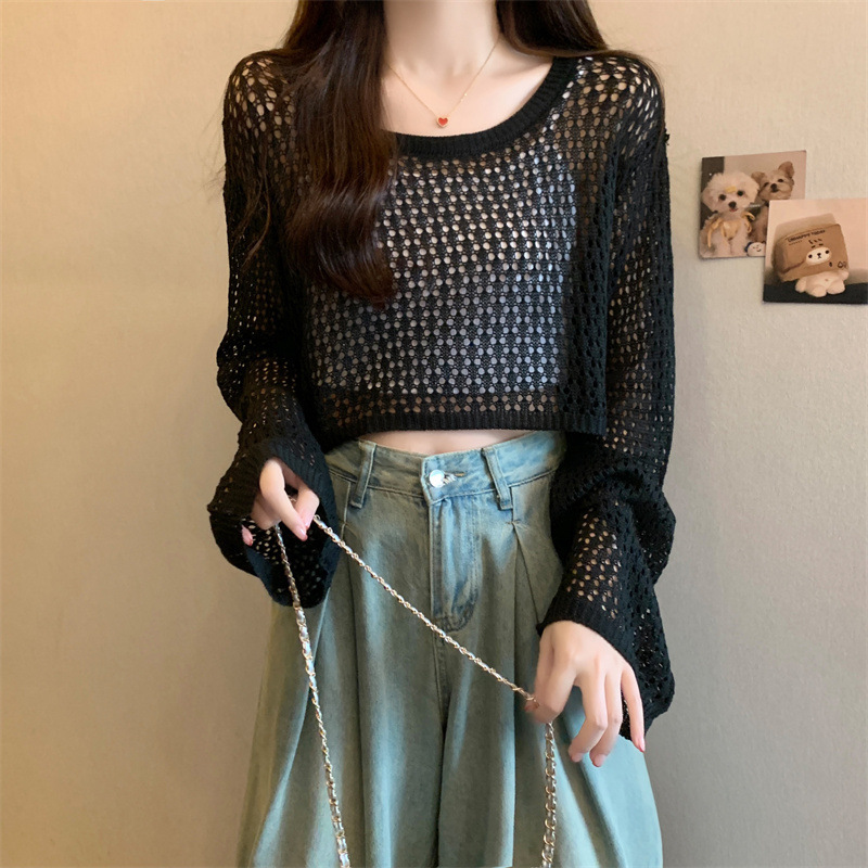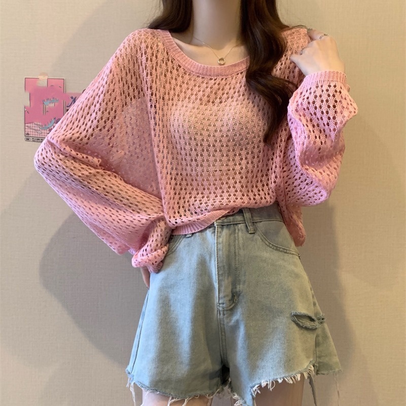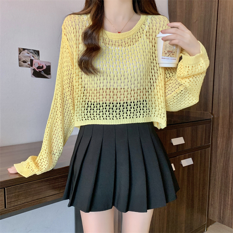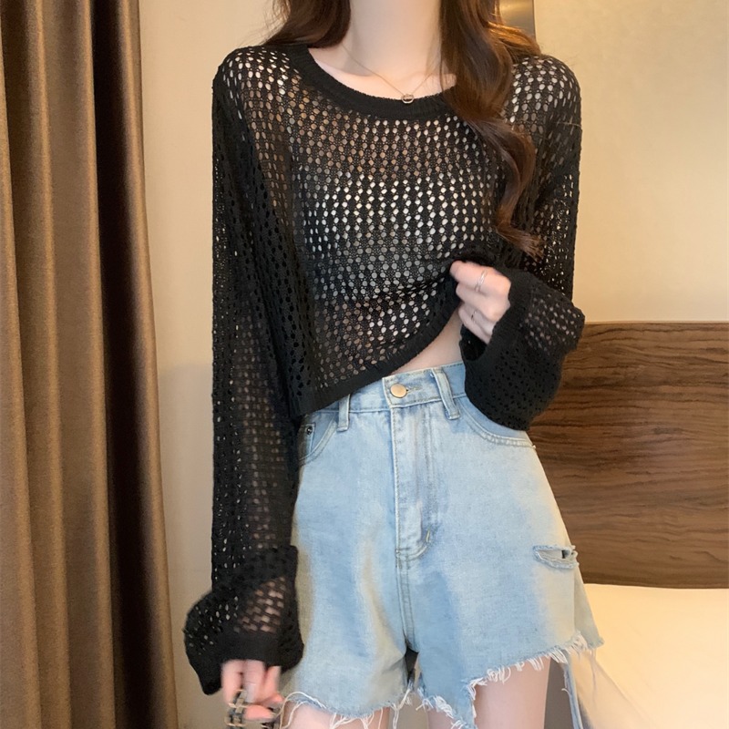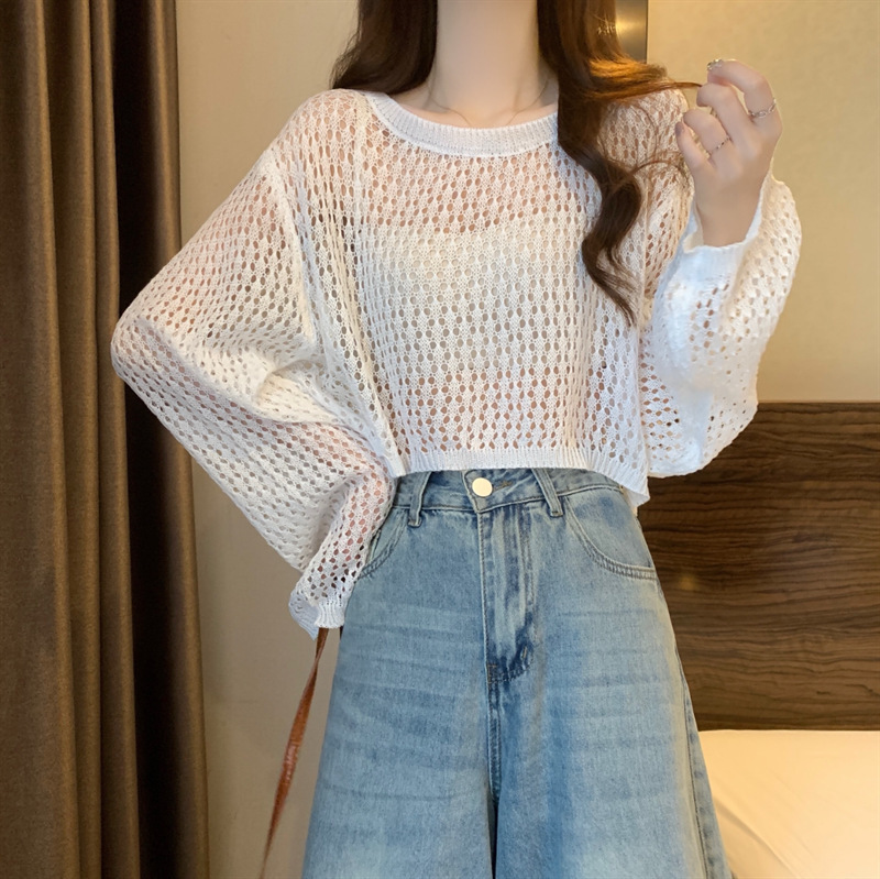 느슨한 랜턴 소매 짧은 빈 블라우스 여성의 여름 Tulle 메쉬 캔디 컬러 달콤한 라운드 넥 긴 소매 스웨터