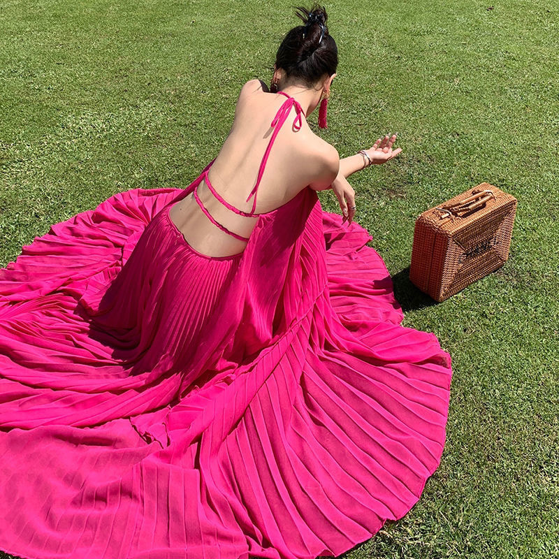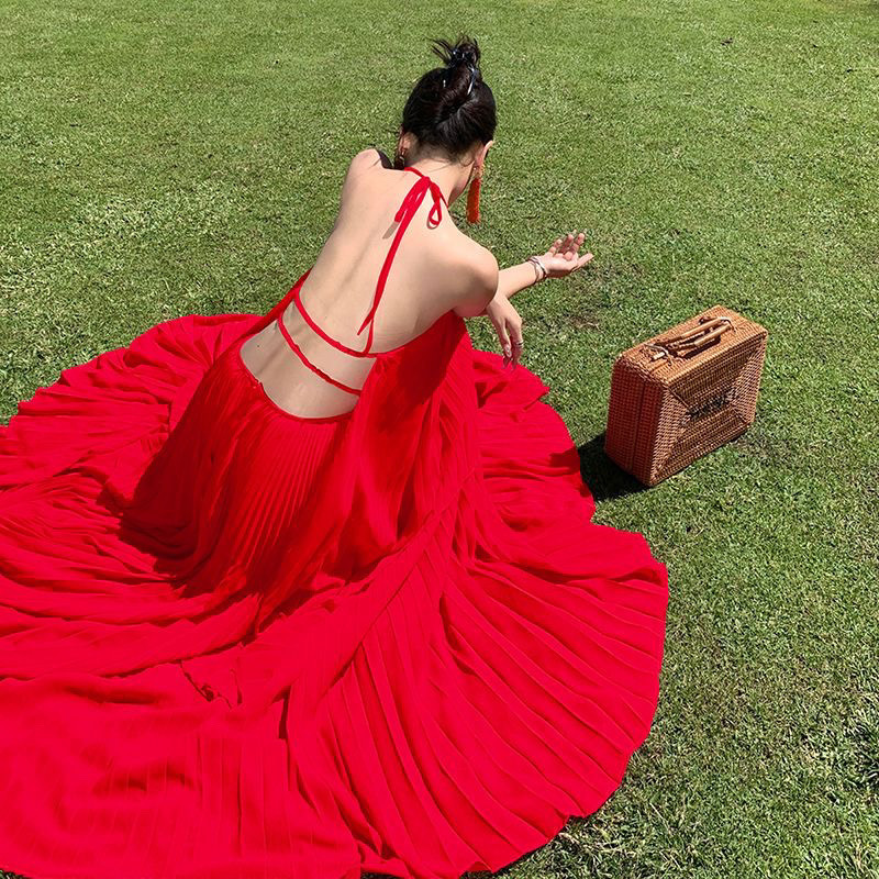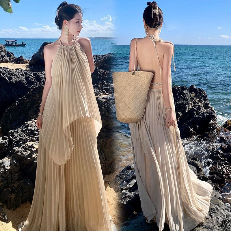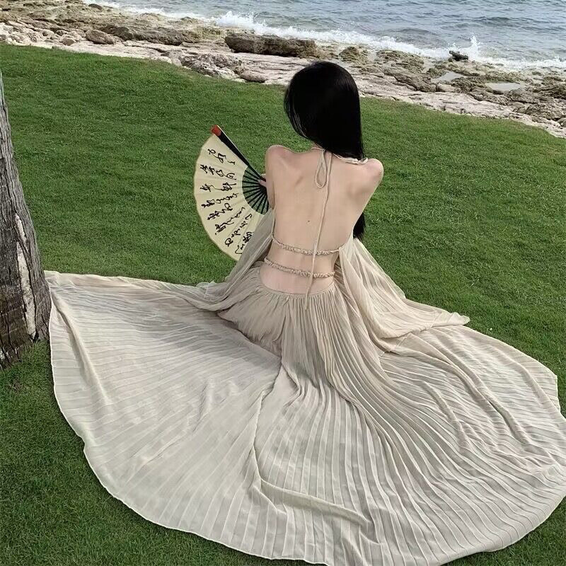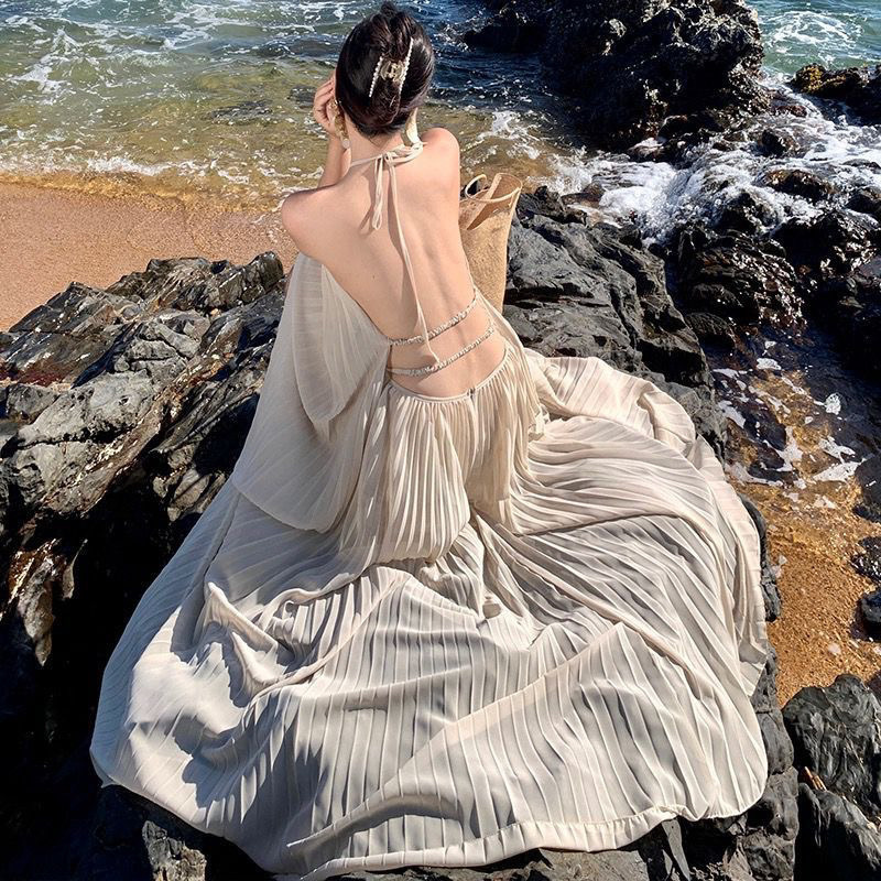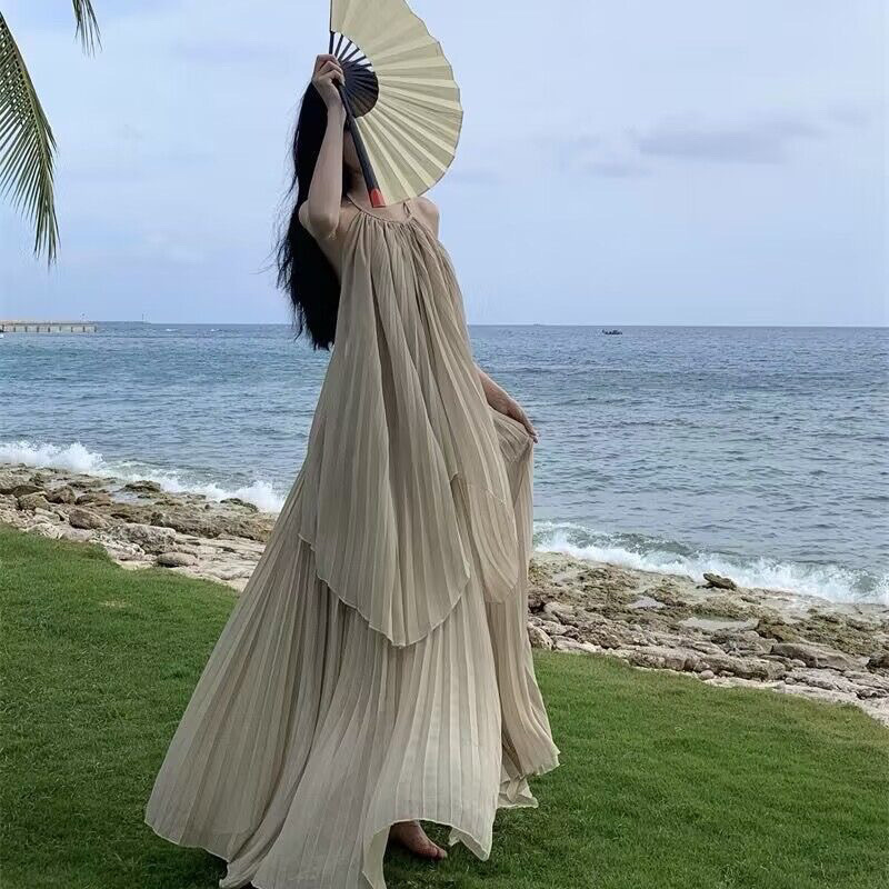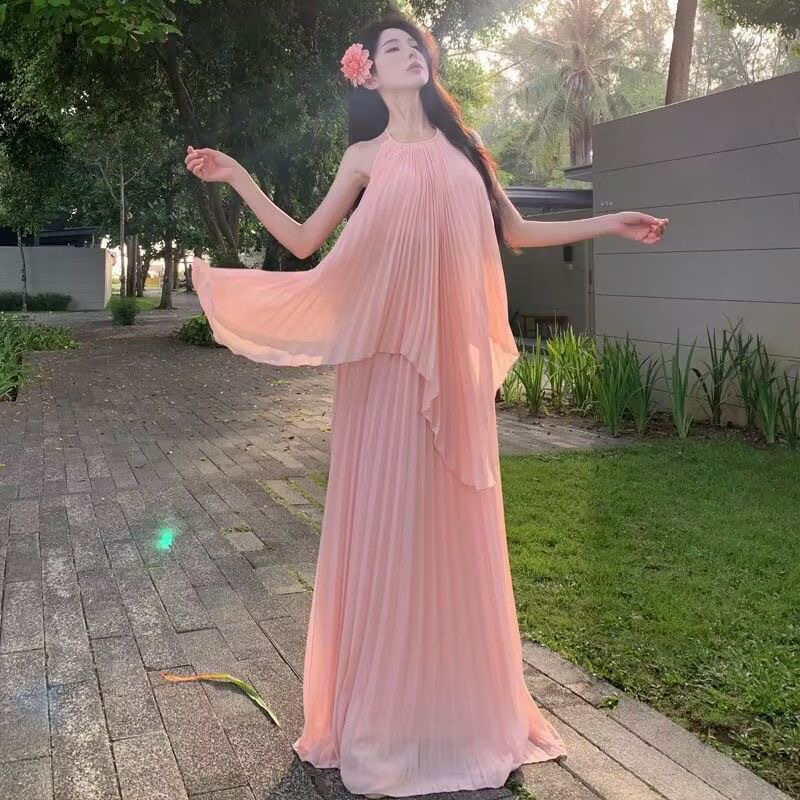2025 년 여름 해변 휴일 긴 원피스 고급 분위기 촬영 여신 큰 스윙 우아한 요정 세트 원피스 입고