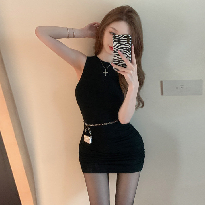 순수한 욕망 뜨거운 소녀 섹시한 주름 둥근 목 민소매 조끼 엉덩이 스커트 여름 슬림핏 높은 허리 유행 원피스 여성