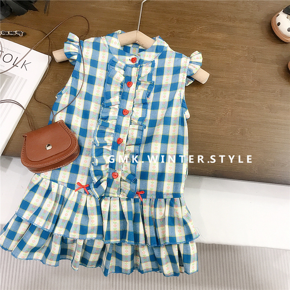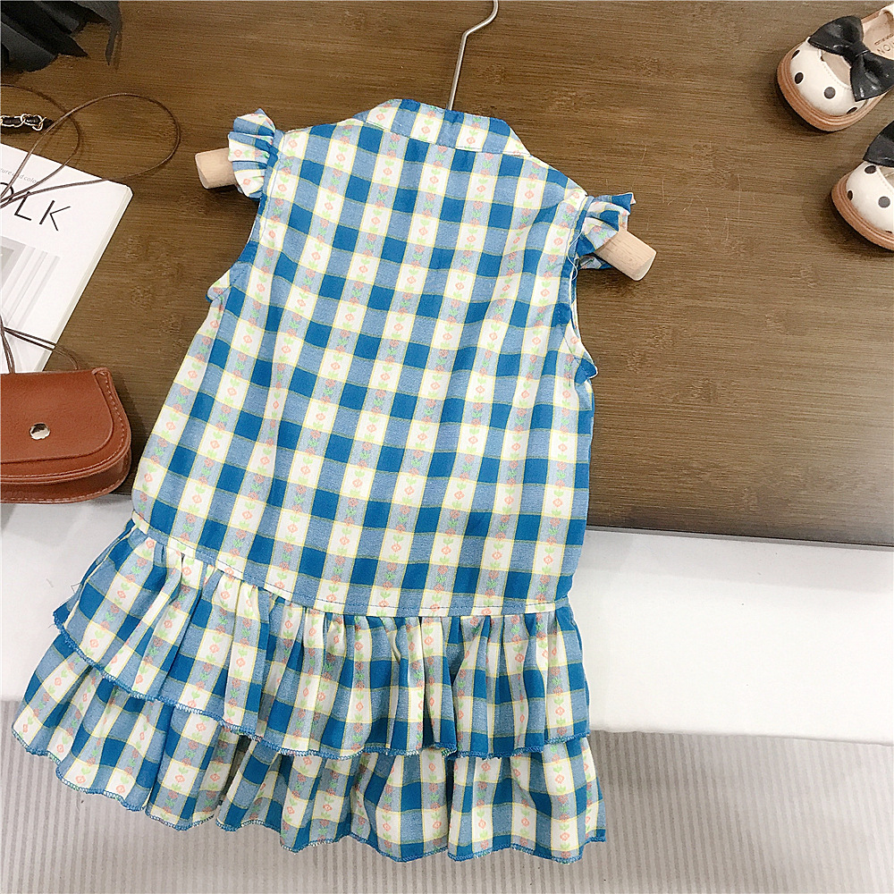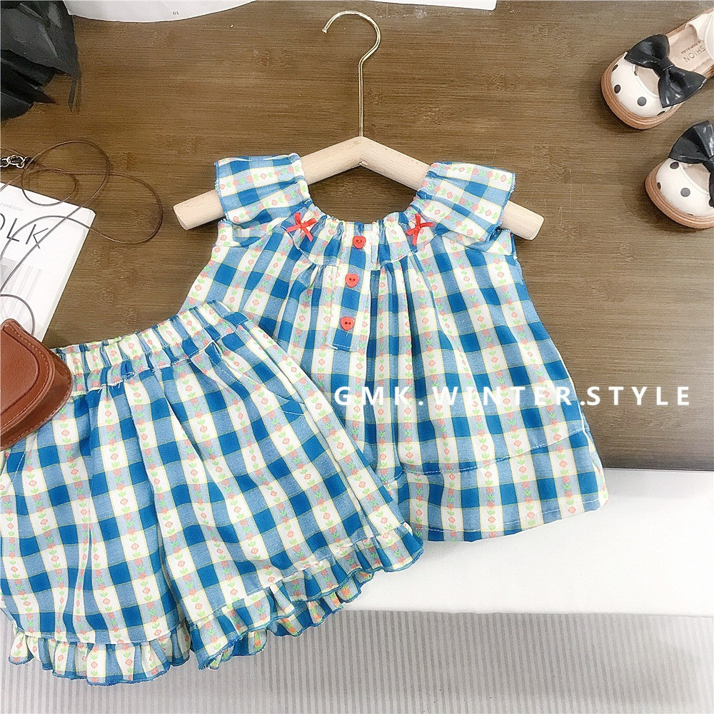 소녀 여름 새로운 도착 원피스 소녀 2 피스 세트 클래식 격자 무늬 소녀 옷 조끼 반바지 유행 대외 무역스토어 가기