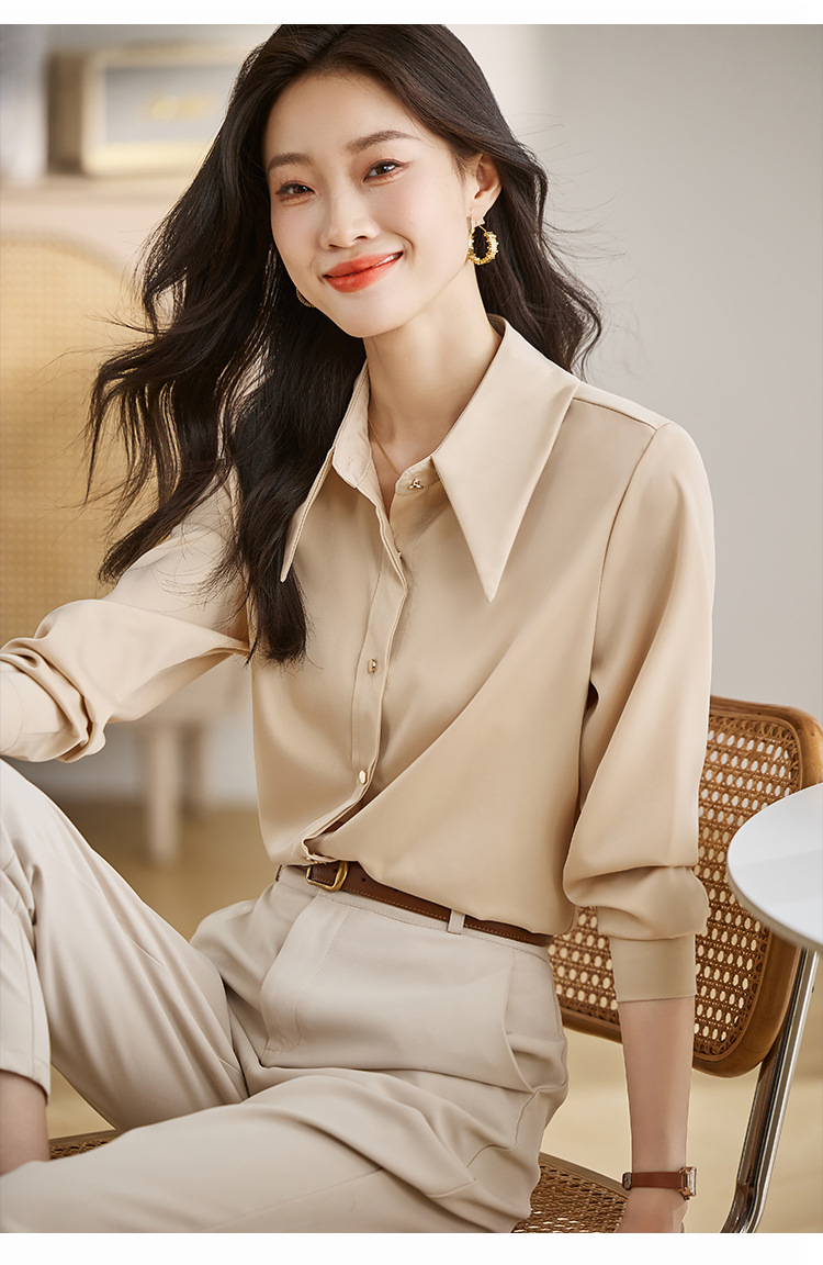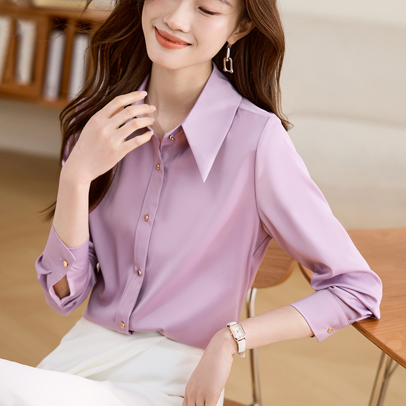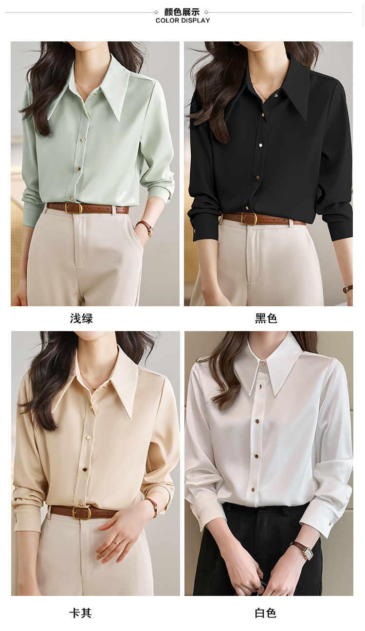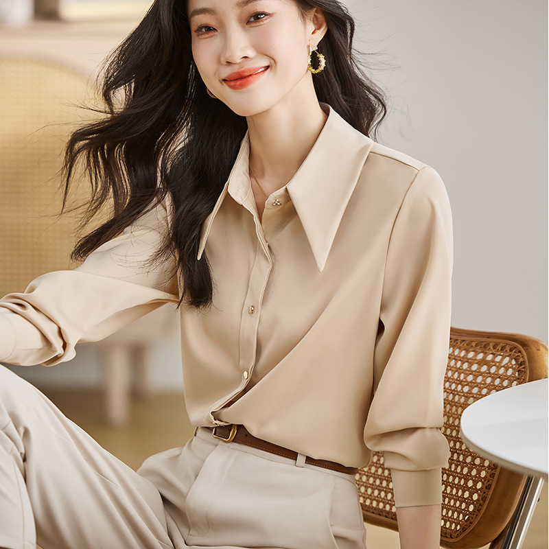 2025 봄 Acetic Acid Satin 셔츠 디자인 센스 틈새 의상 패션 우아한 전문 라이트 성숙한 스타일 여성 의류스토어 가기
