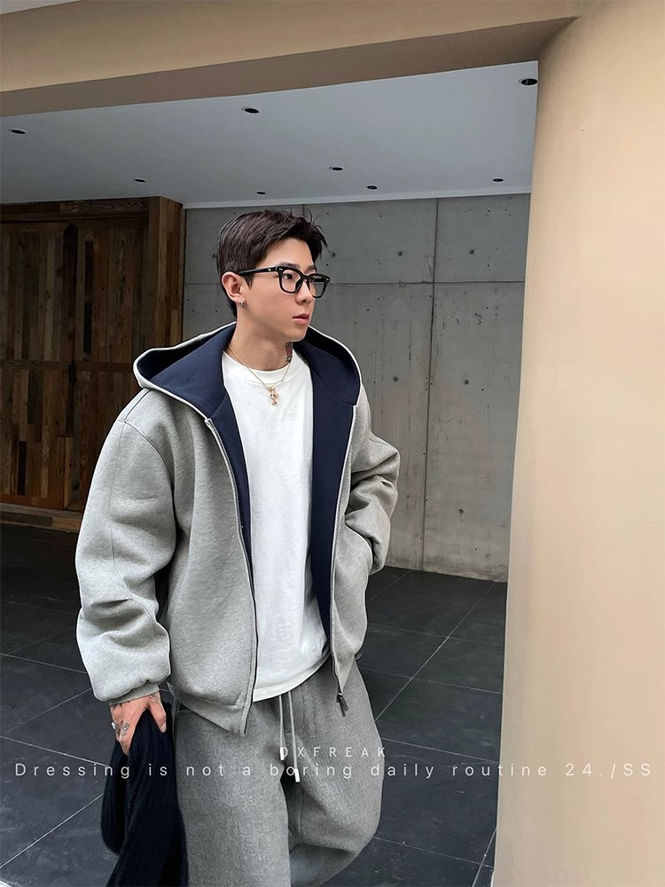 새로운 Duffy Handsome American Heavy Double Zipper Hooded Sweater Jacket Men's Duffy Handsome 캐주얼 재킷 대조 컬러 커플 카디건