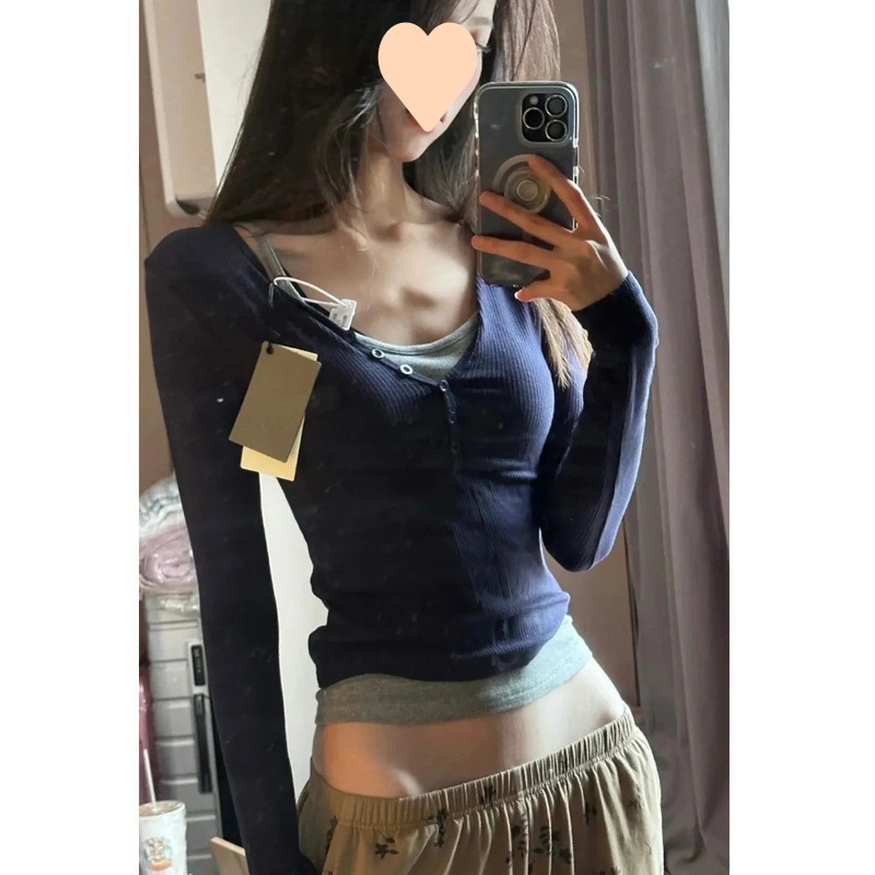 미국식 레트로 페이크 투피스 긴팔 셔츠 여성용 틈새 하이 엔드 패셔블 슬림 모양의 살로 덮인 스파이스 걸 콘트라스트 탑