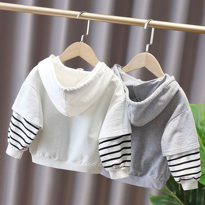 봄과 가을 남녀 아동복 스웨트 셔츠 아기의 서양식 어린이 성격 유행 브랜드 한국 알파벳 줄무늬 가짜 2 피스 후드스토어 가기