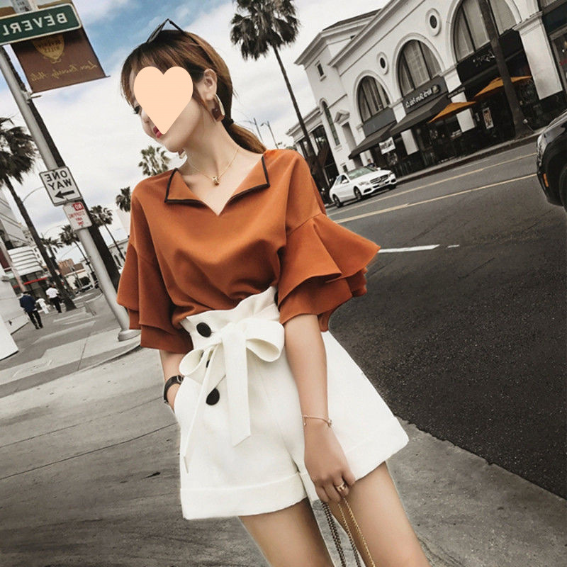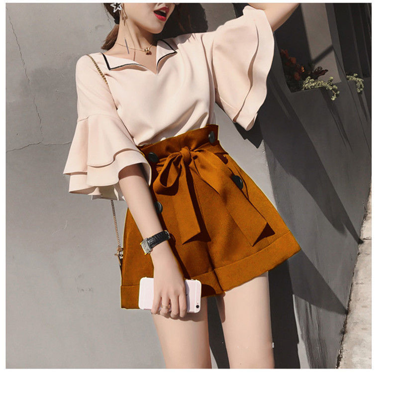 칼라 반팔 쉬폰 셔츠 바지 세트 여성 여름 새로운 도착 플러스 사이즈 느슨한 슬리밍 높은 허리 와이드 레그 반바지 투피스 세트스토어 가기