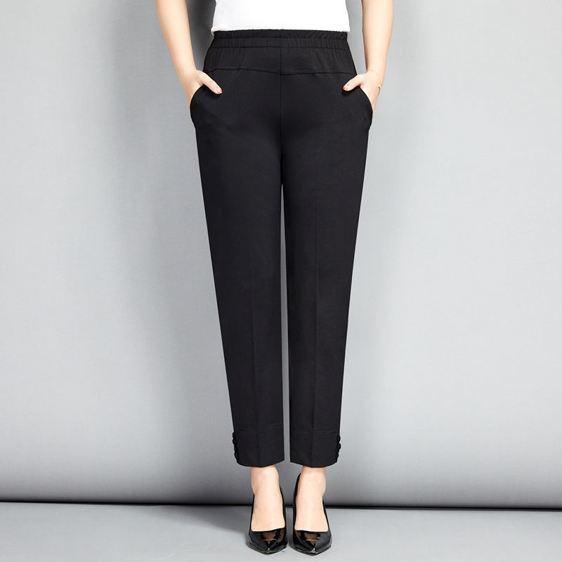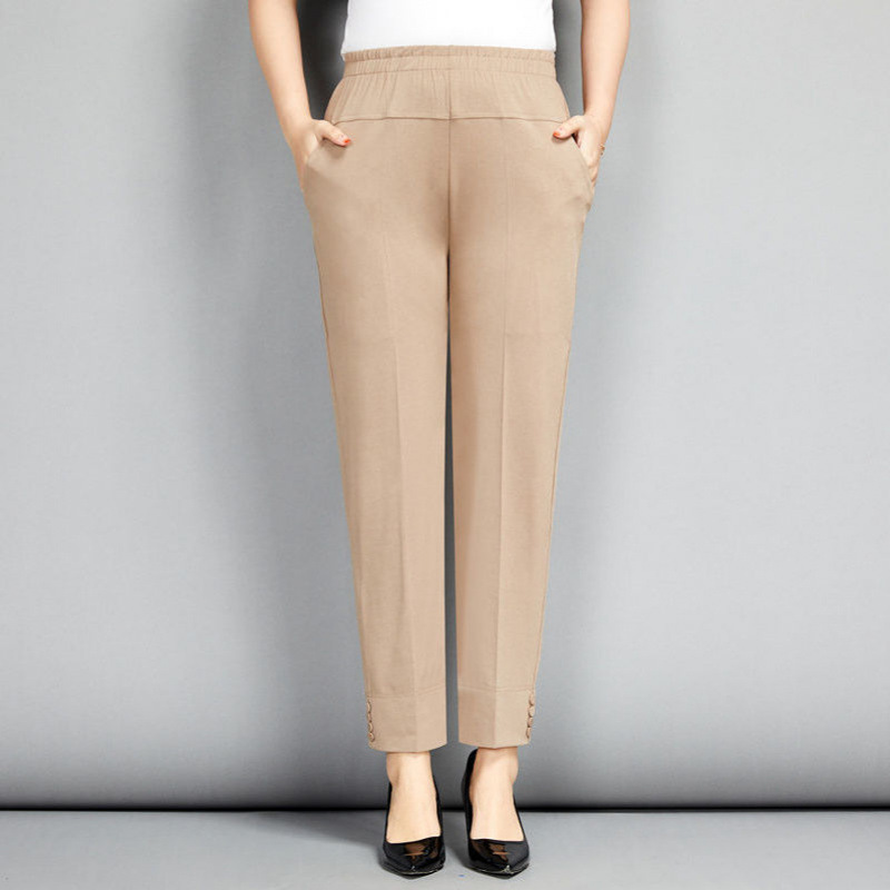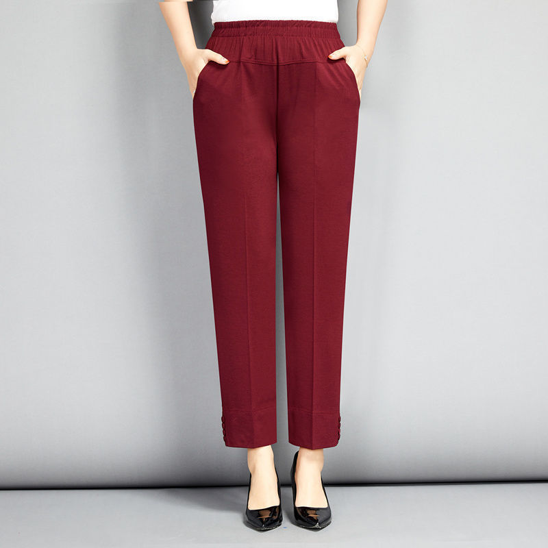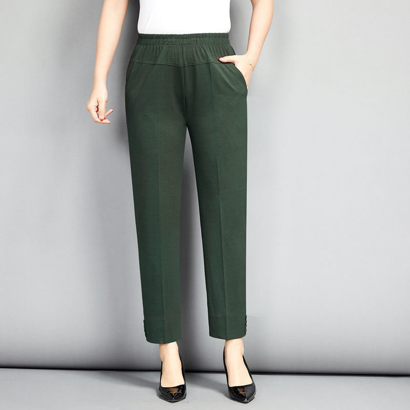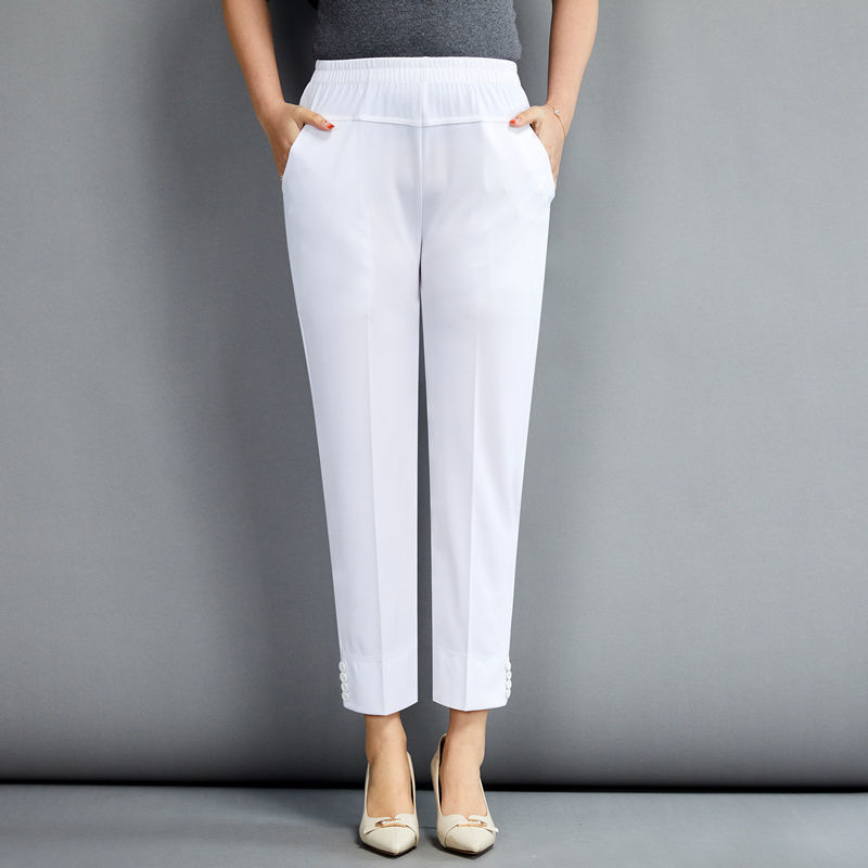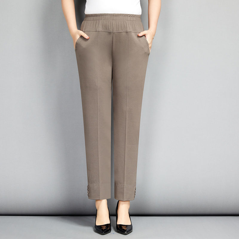 짧은 자른 바지 여성의 여름 얇은 얼음 실크 중년 및 노인 여성 바지 높은 허리 탄성 캐주얼 바지 스트레치 엄마 바지