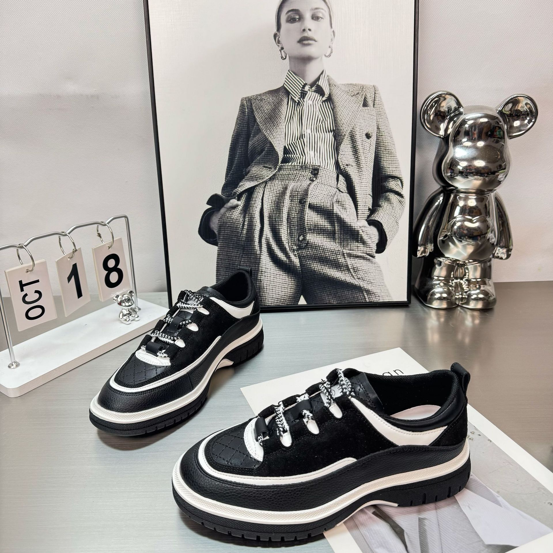 정품 가죽 여성 신발 깊은 입 캐주얼 운동화 2025 봄과 가을 새로운 스타일 샤넬 스타일 스니커즈 팬더 여성 싱글 슈즈