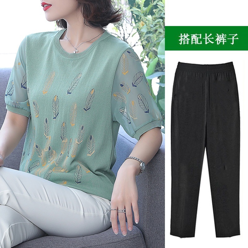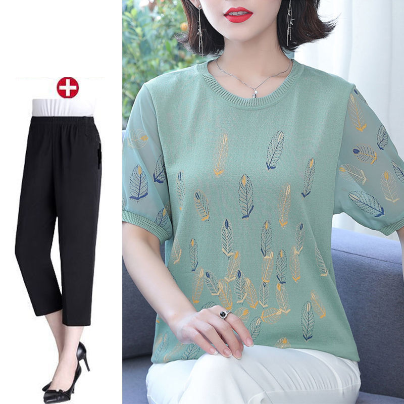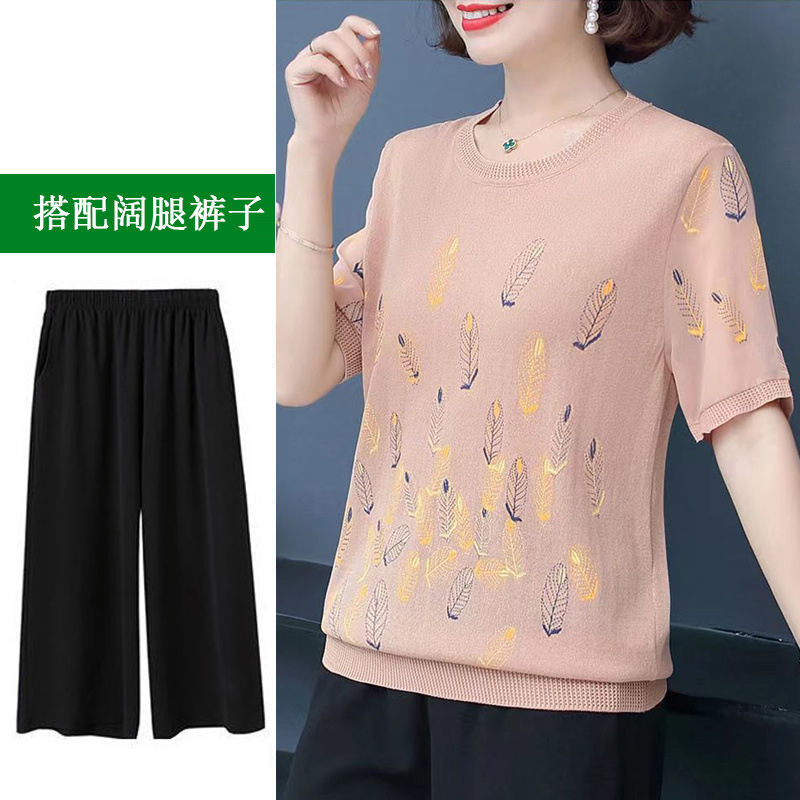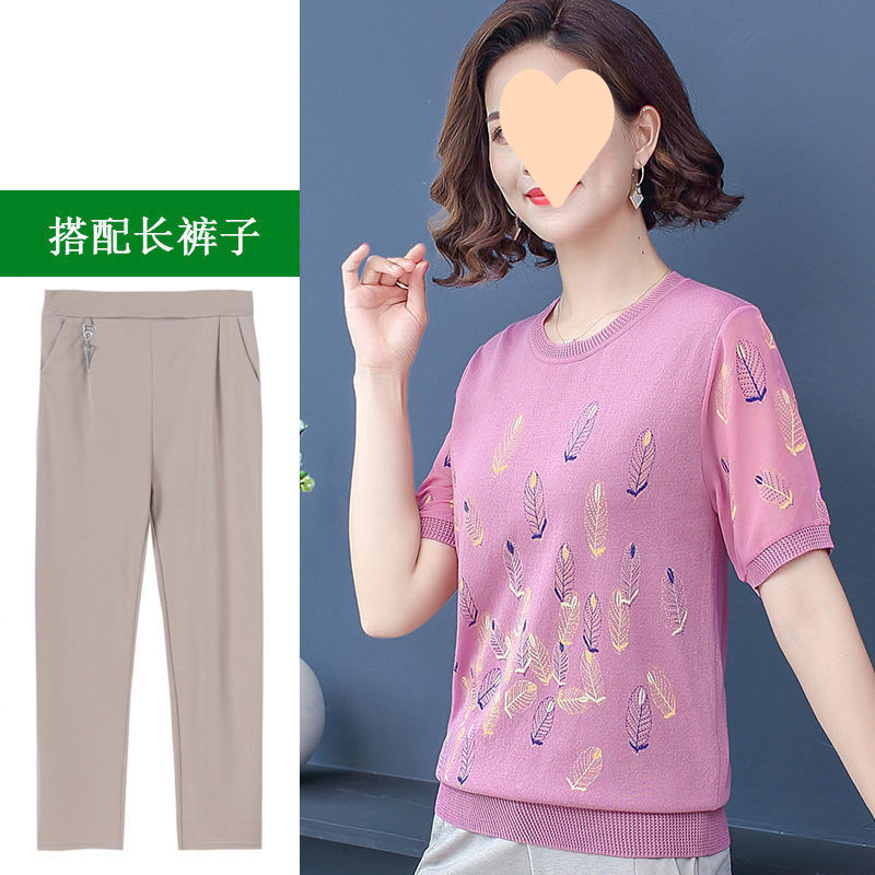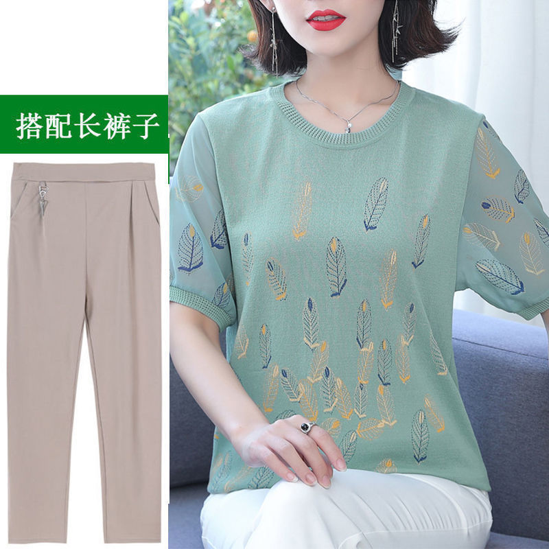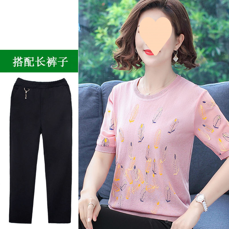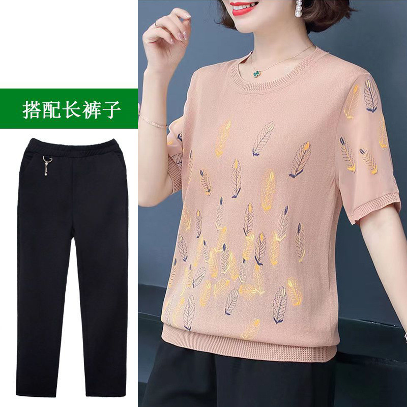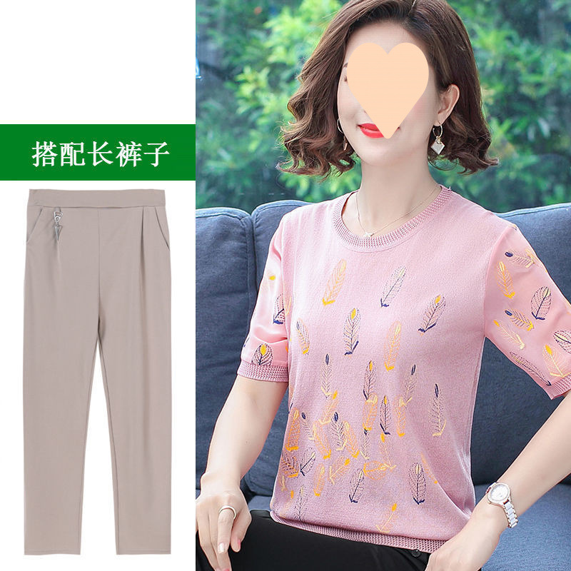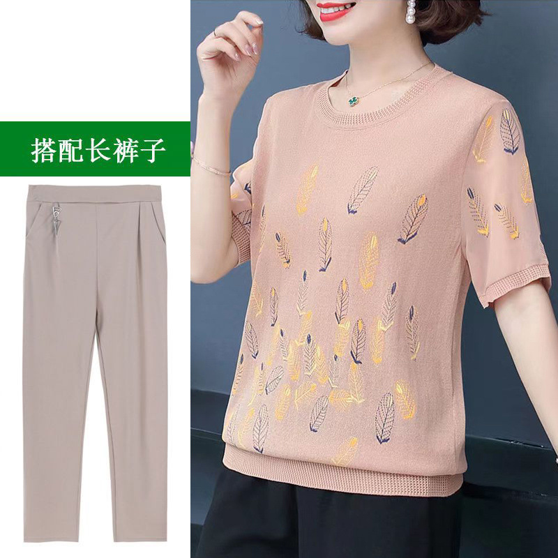 어머니의 여름 아이스 실크 반팔 셔츠 서양식 2024 새로운 중년 및 노인 여성의 여름 탑 투피스 세트
