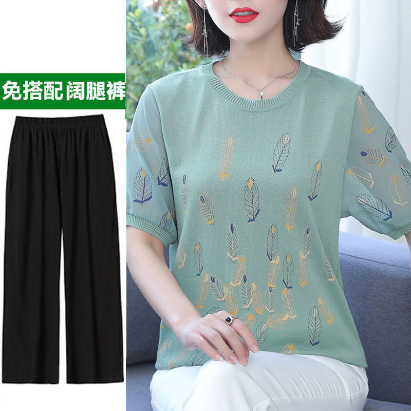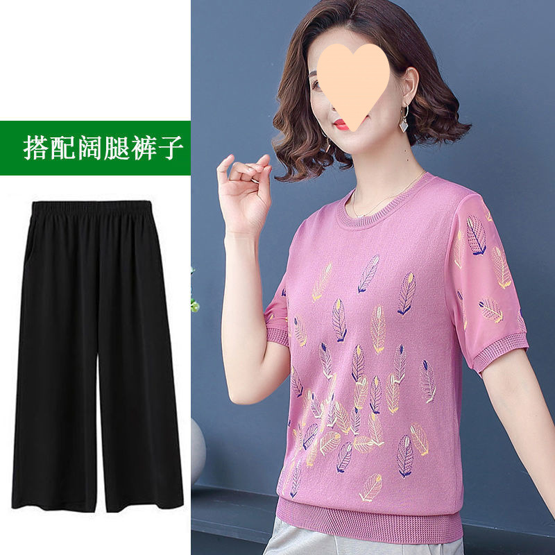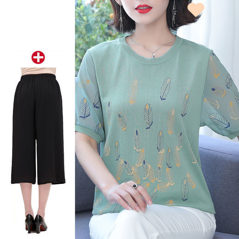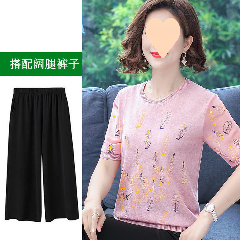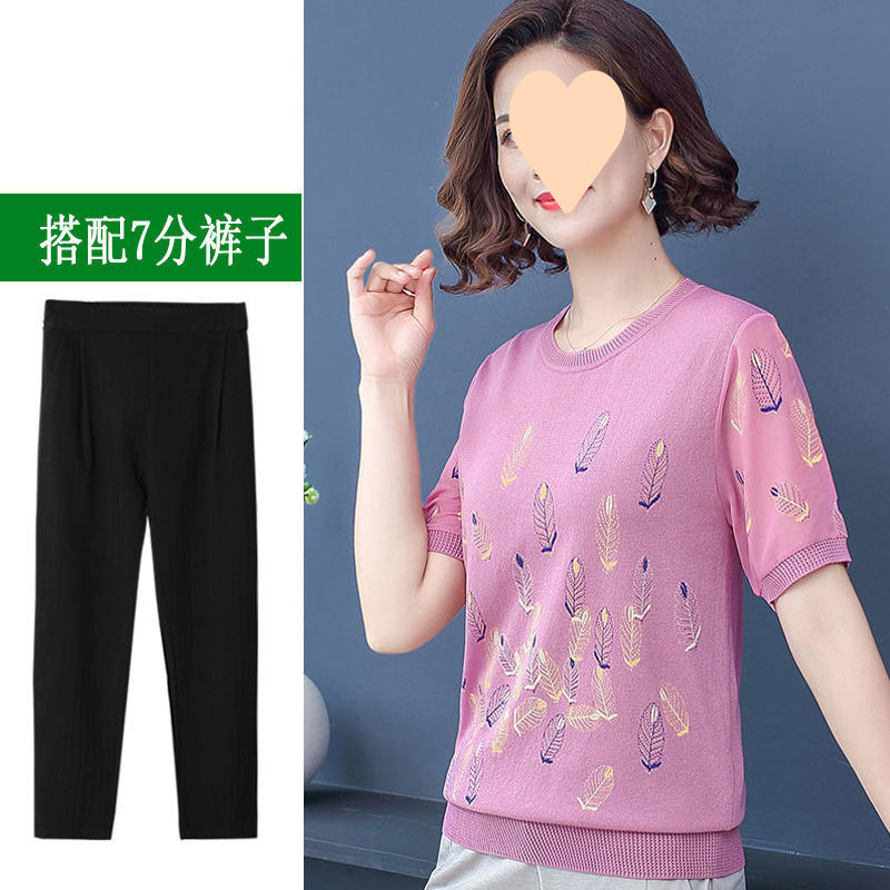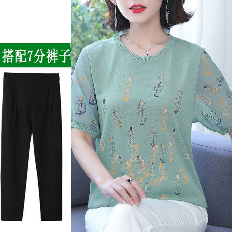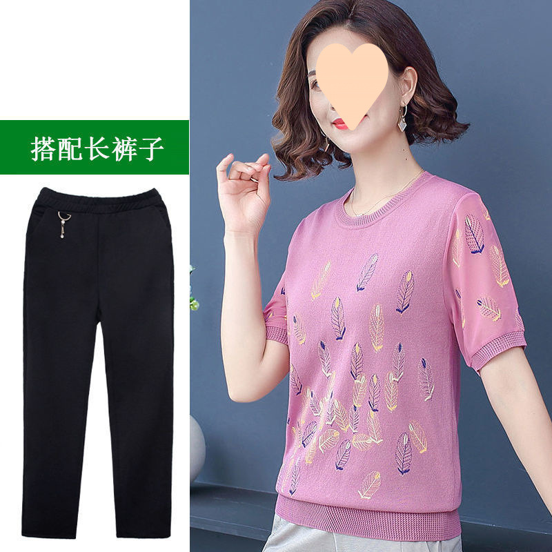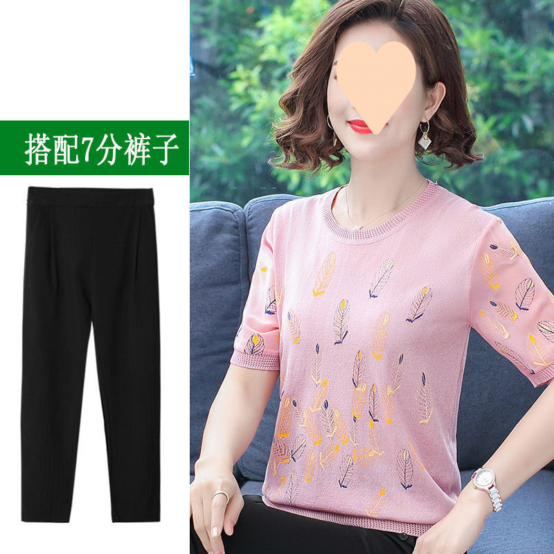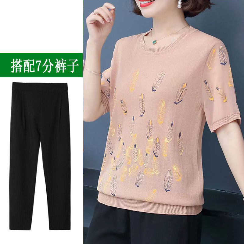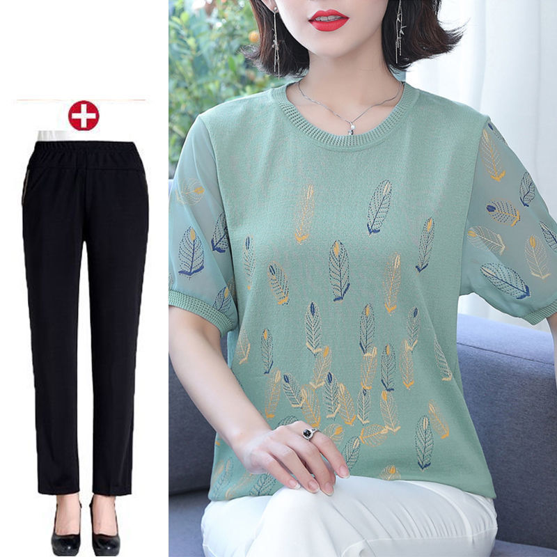 어머니의 여름 아이스 실크 반팔 셔츠 서양식 2024 새로운 중년 및 노인 여성의 여름 탑 투피스 세트