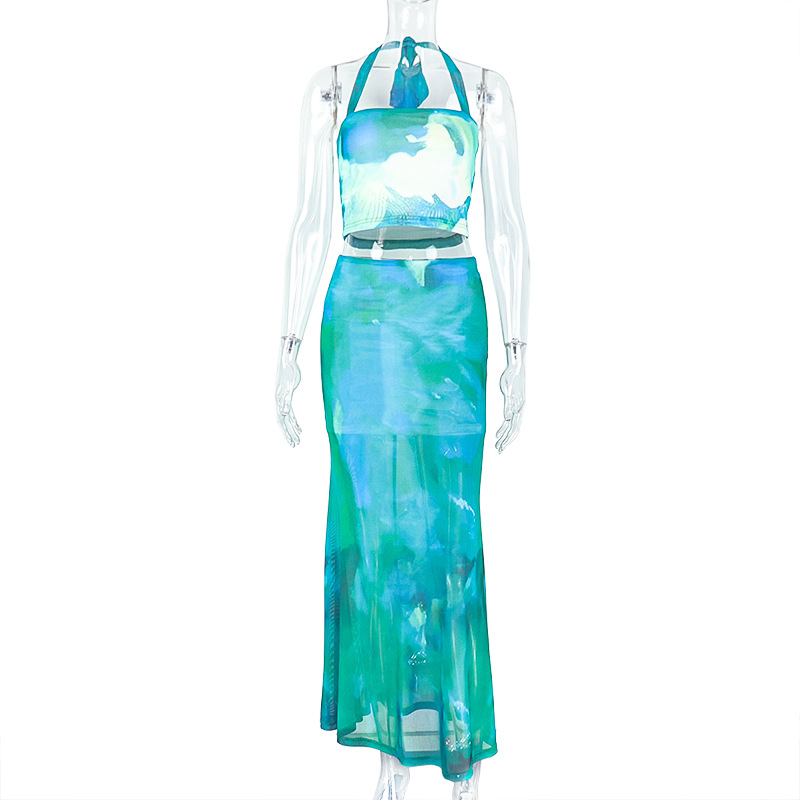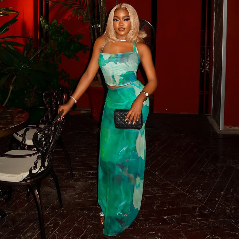 유럽과 미국 스타일의 국경 인쇄 컬러 매칭 스커트 세트 백 힙합 칼라 슬링 롱 스커트 투피스 신선한 슬림 핏 여성용 원피스스토어 가기