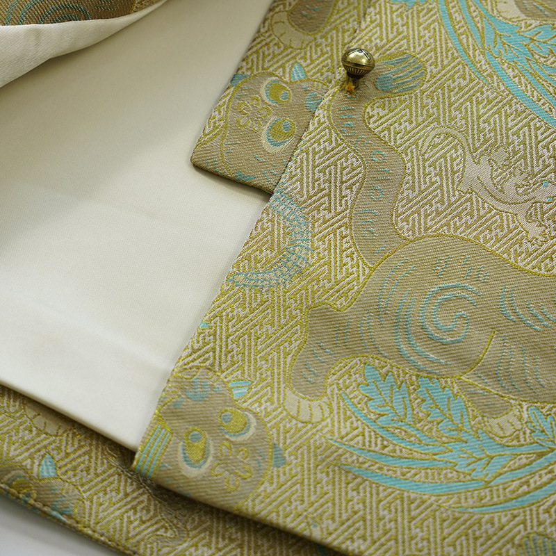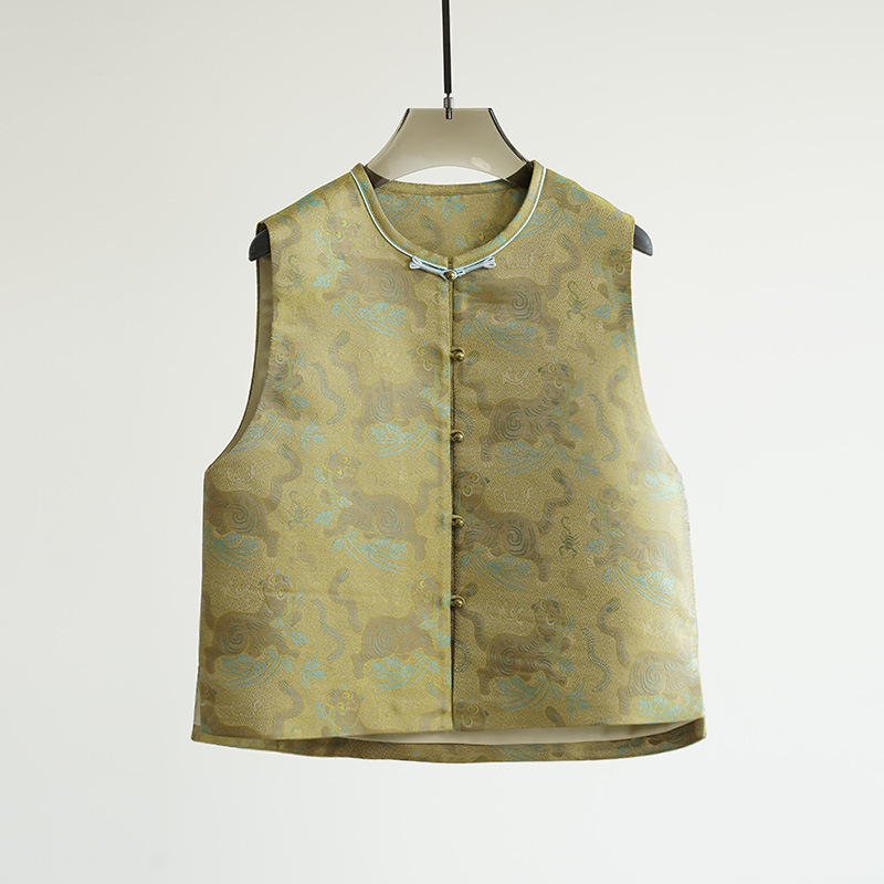 【호전오독】뽕나무 실크로 짠 금색 올드 송진 중국풍 단추 없는 민소매 조끼 여성용 레트로 스타일