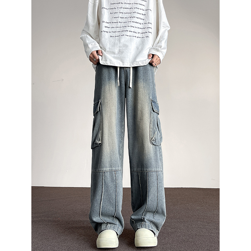 세탁 된 빈티지 툴링 청바지 남자 봄과 여름 새로운 미국 스타일 하이 스트리트 올매치 와이드 레그 멀티 포켓 캐주얼 롱 팬츠