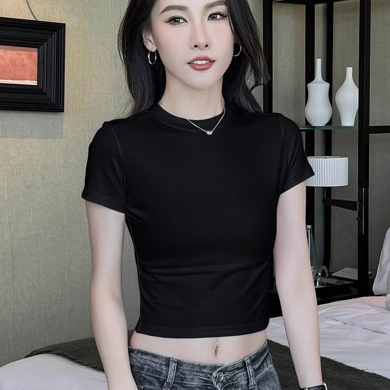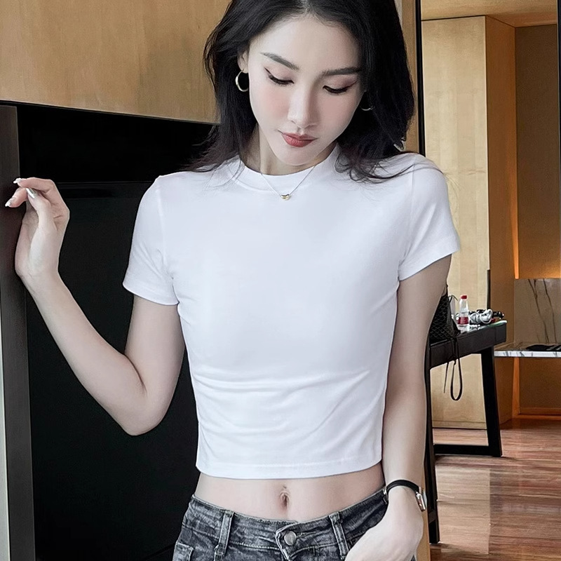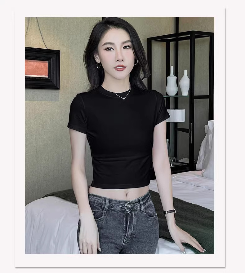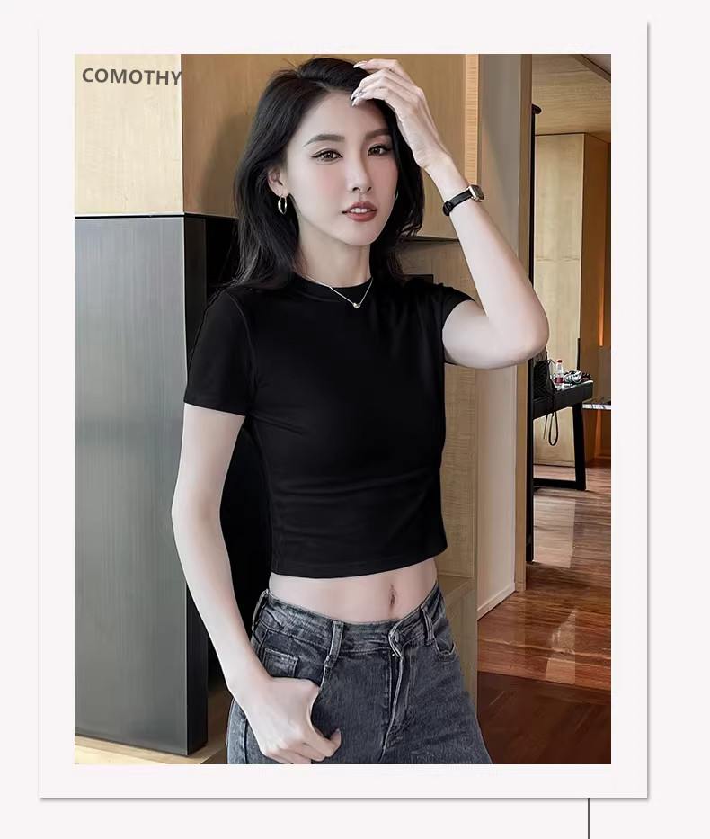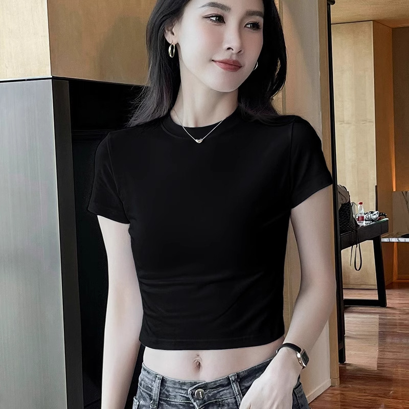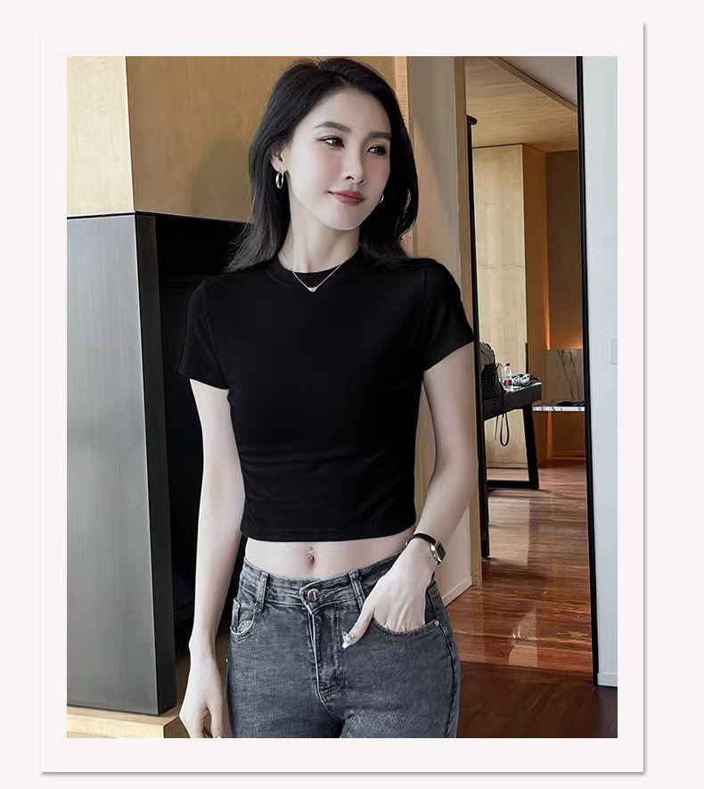 새로운 짧은 티셔츠 여성용 반팔 탑 블랙 솔리드 컬러 높은 허리 스파이스 소녀 작은 티셔츠 섹시한 배꼽 여름스토어 가기