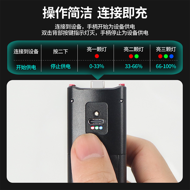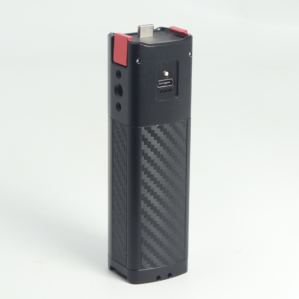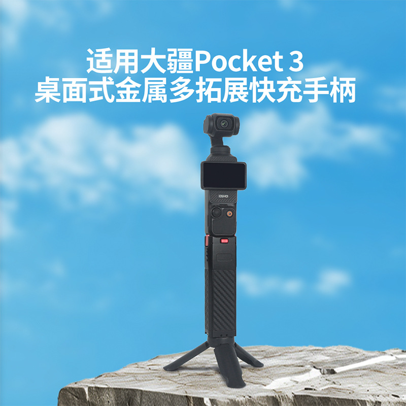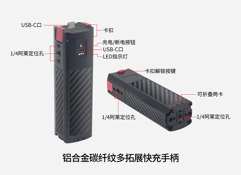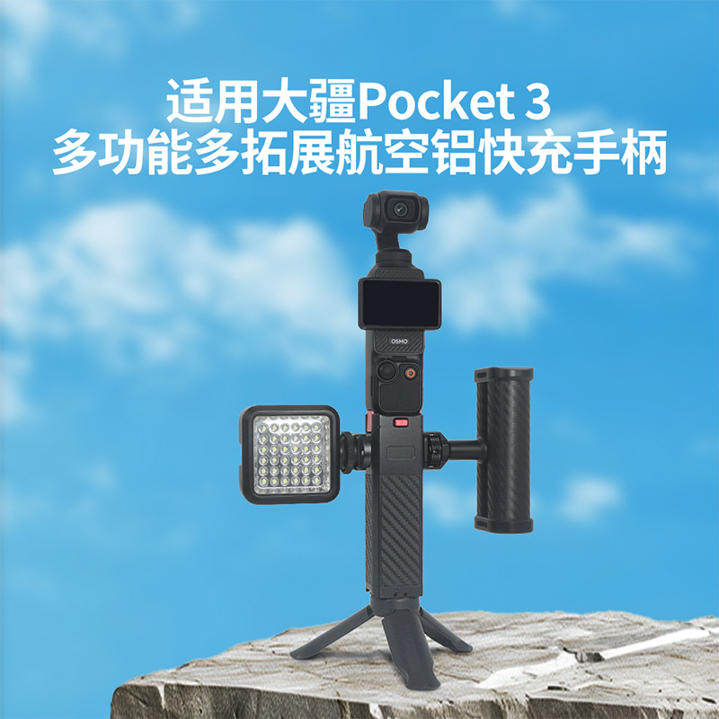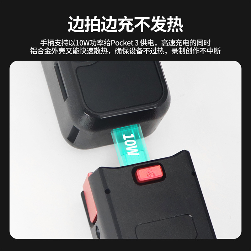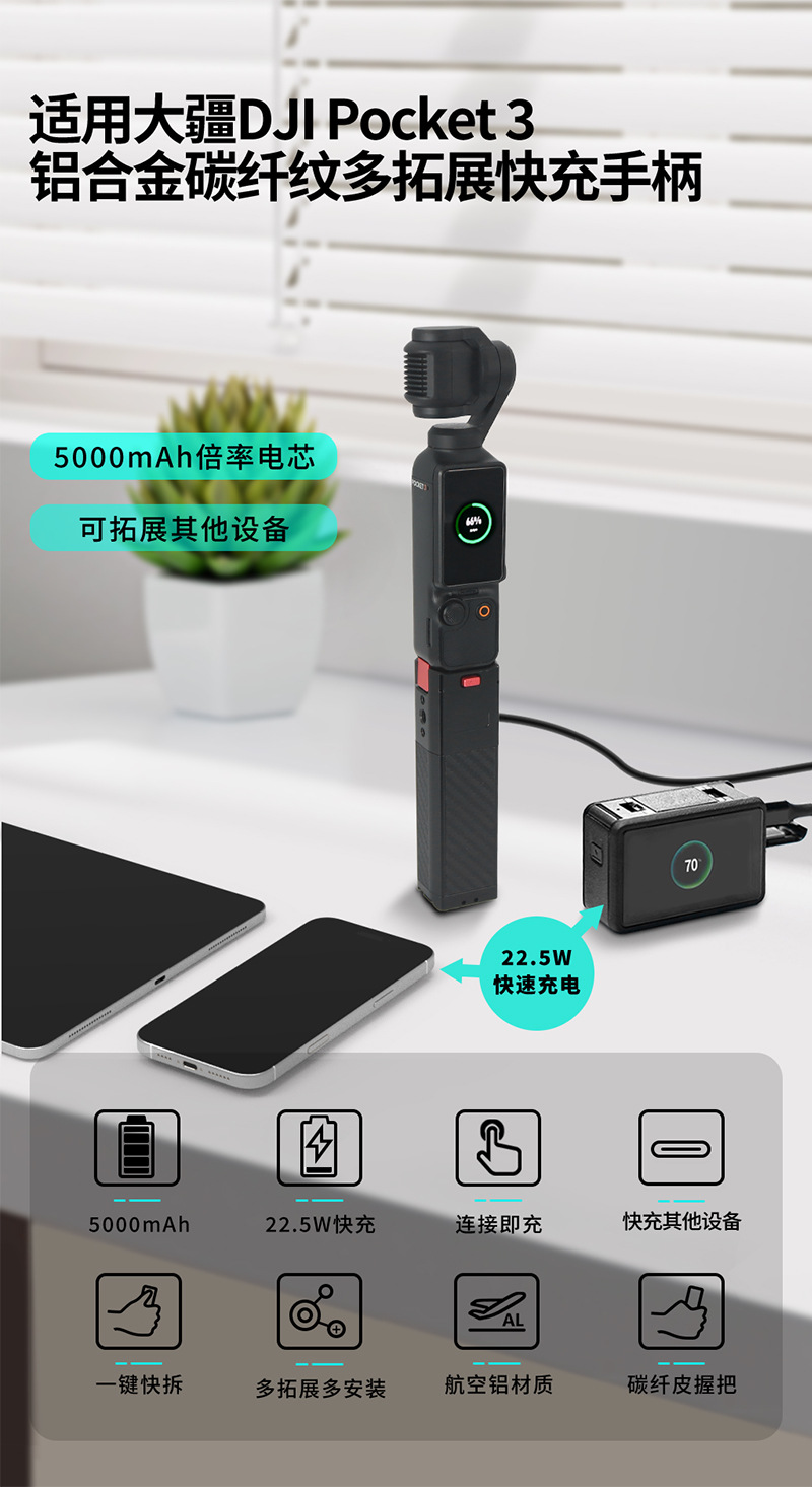 二、产品亮点:ZS52733 铝合金材质便于散热 碳纤纹理美观 扩展丰富 手柄左右侧有1/4阿莱定位孔 可扩展安装补光灯 麦克风 收音设备等 底部有折叠磁吸两卡 可安装三卡配件 并带有1/4阿莱定位孔 可安装三脚架 自拍杆等 5000毫安续航相对原相机电池的3倍多,POCKET 3专用C口支持最高10W供电 侧边C口为充放电口 最高支持25W充放电;