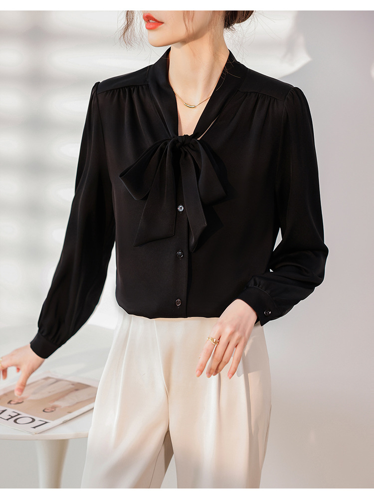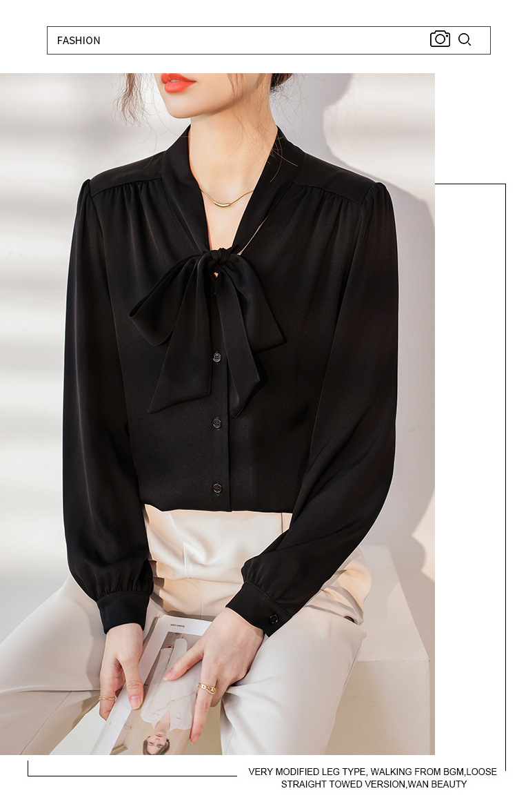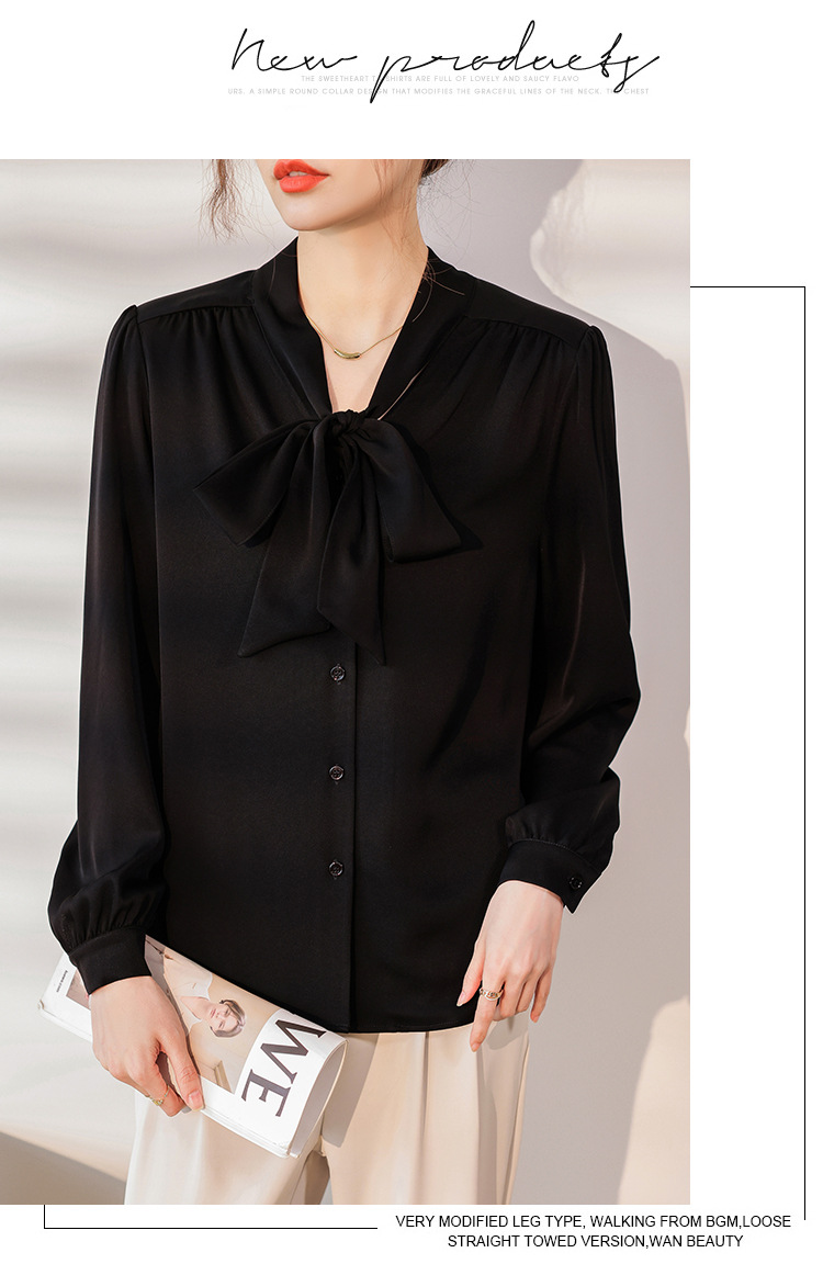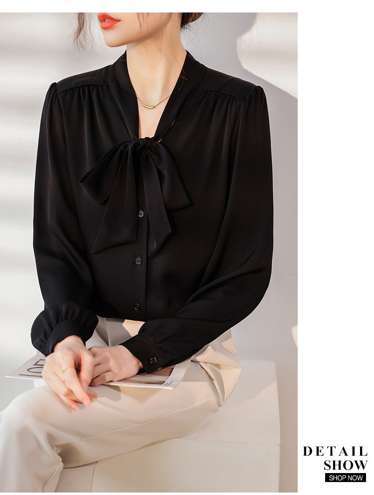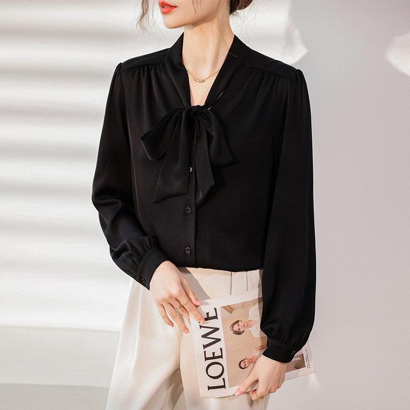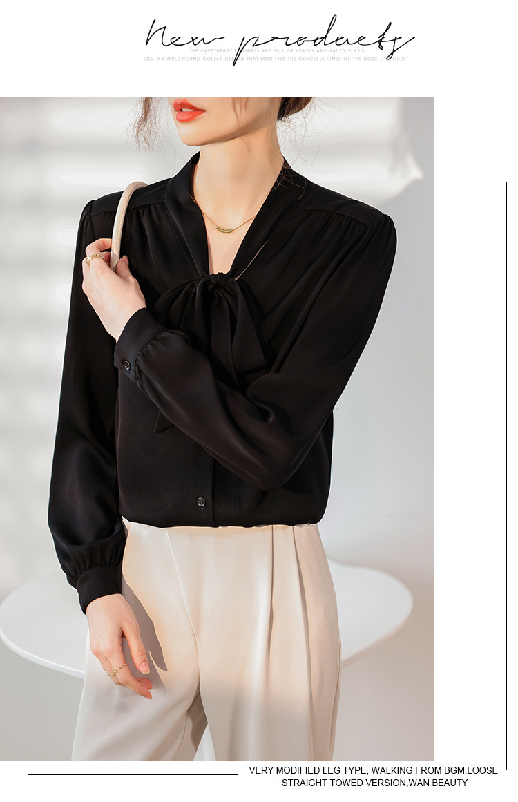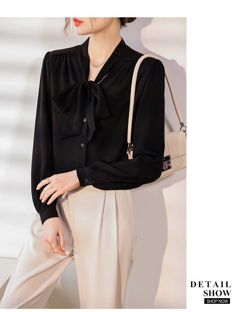 리본 셔츠 여성용 V 넥 레이스 업 보우 아세테이트 Satin 탑 가을 프로 데프 하이 엔드 프렌치 셔츠