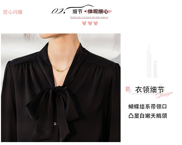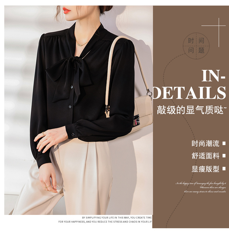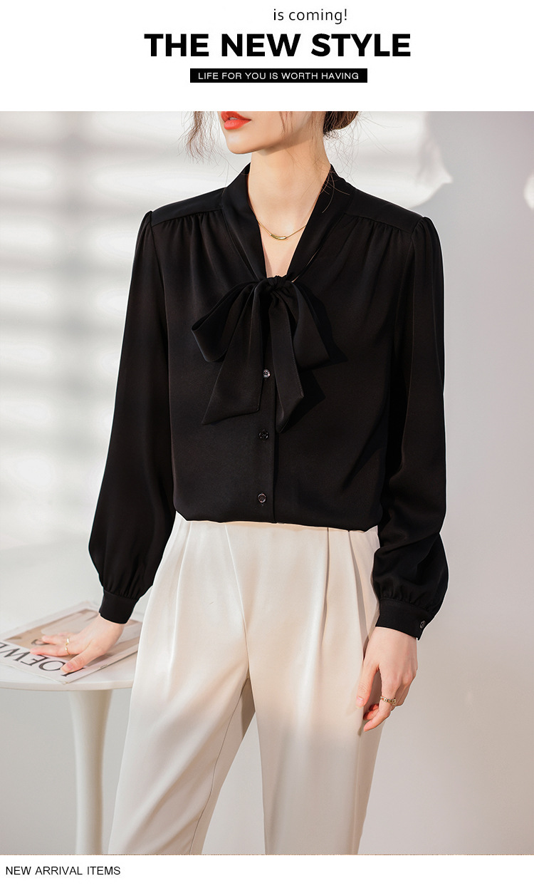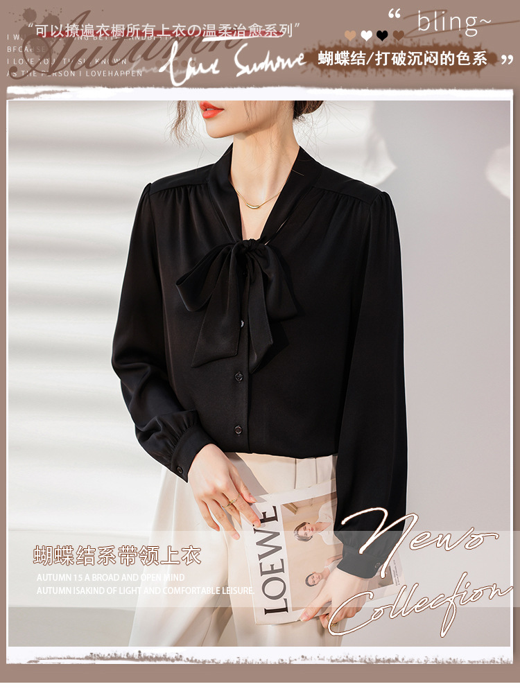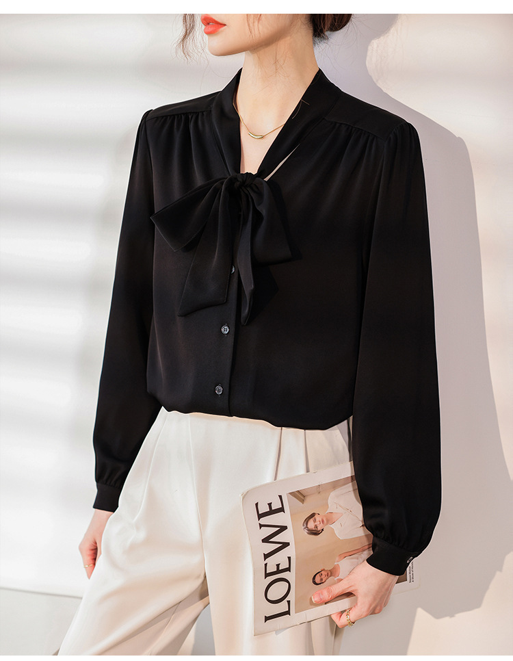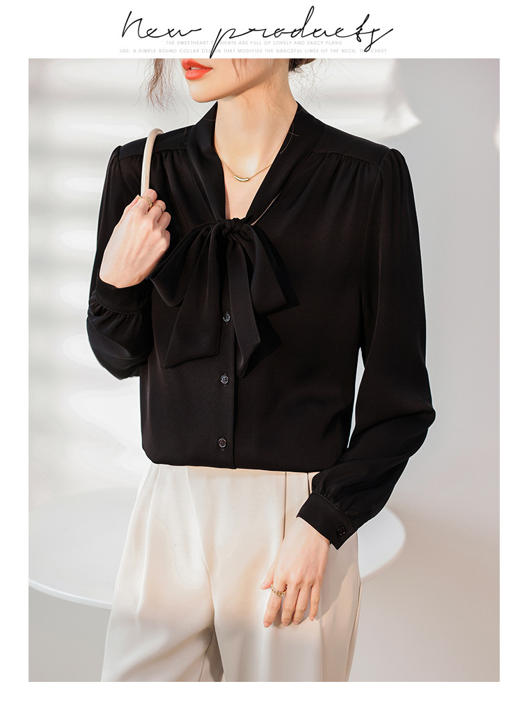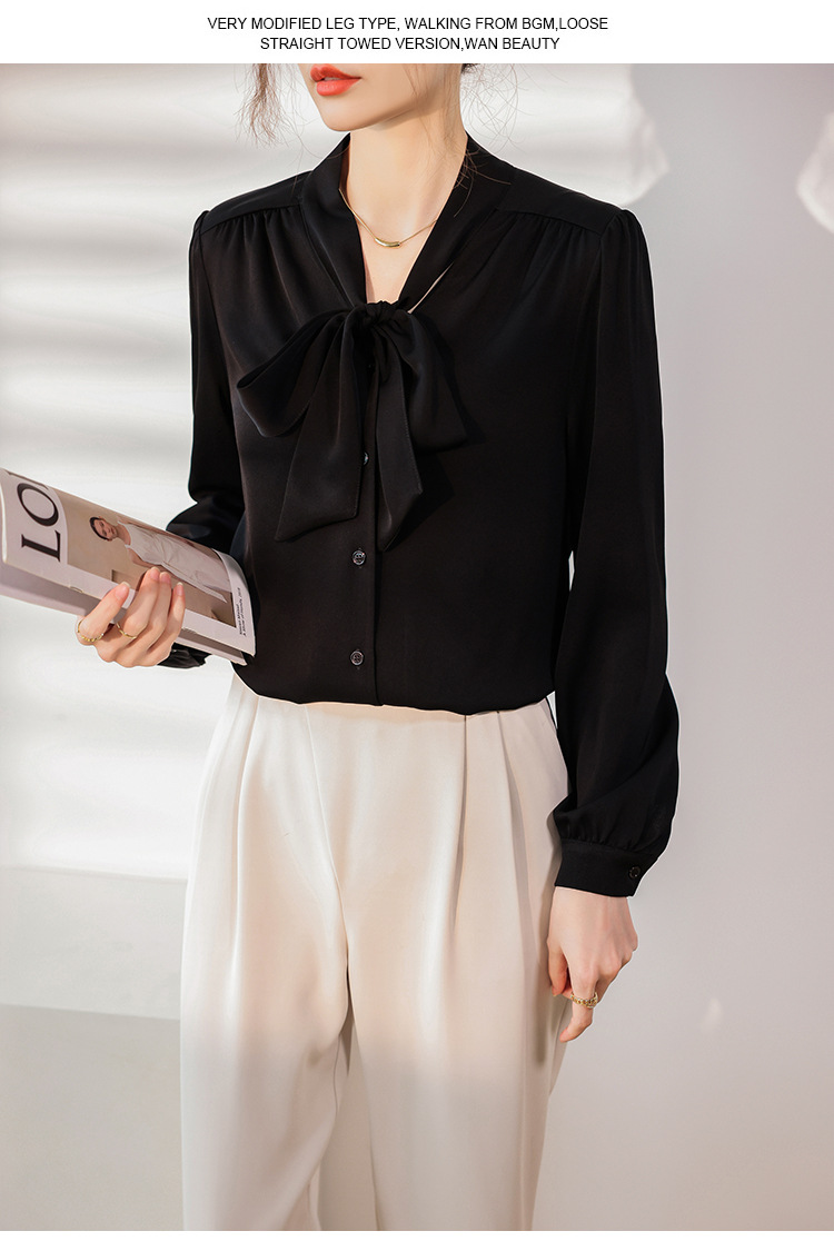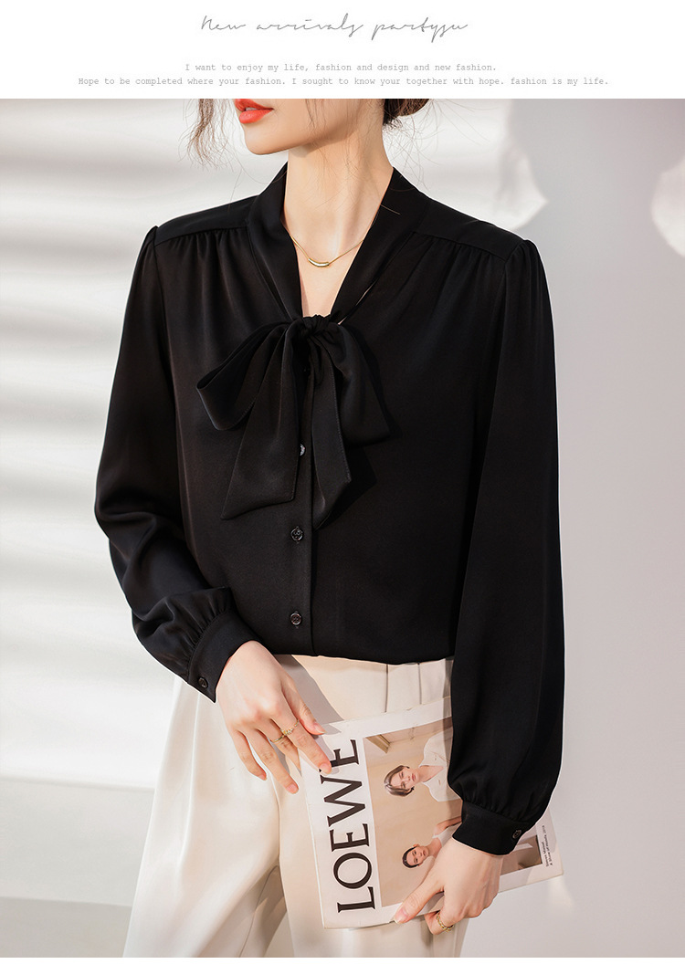 리본 셔츠 여성용 V 넥 레이스 업 보우 아세테이트 Satin 탑 가을 프로 데프 하이 엔드 프렌치 셔츠