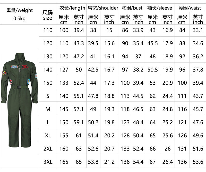 유럽 및 미국 파일럿 유니폼 군복 녹색 점프수트 성인 및 어린이 세트 코스프레 의상 무대 공연 남성용