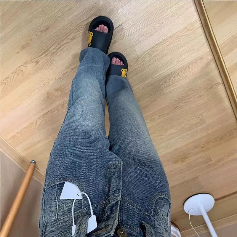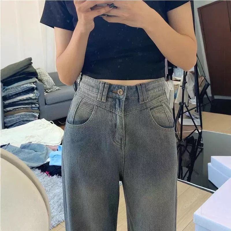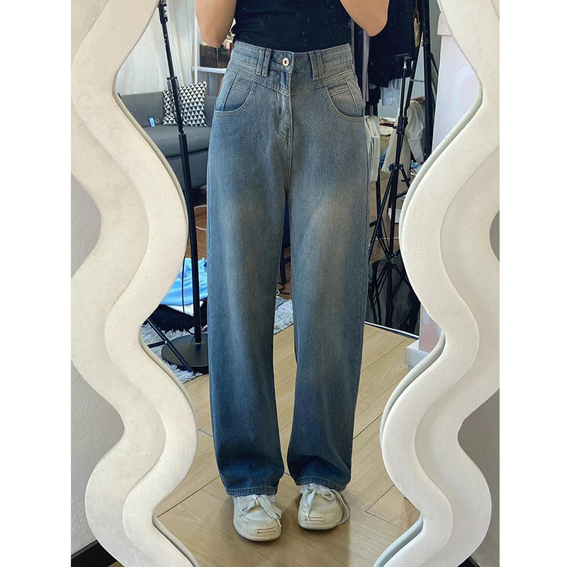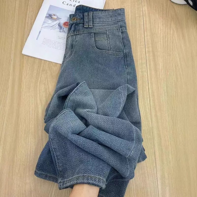 높은 허리 넓은 다리 청바지 여성의 봄과 가을 플러스 사이즈 통통녀 새로운 슬림 모양 수직 별 패턴 스트레이트 바지스토어 가기