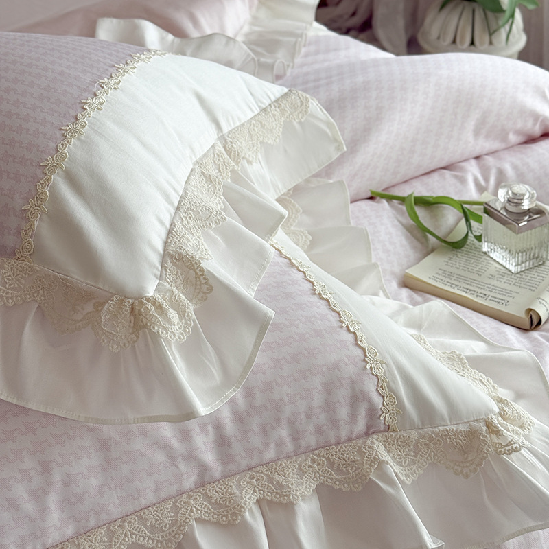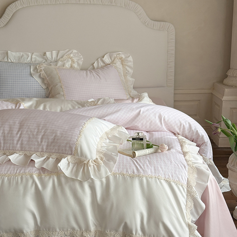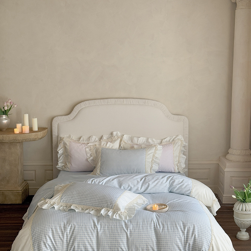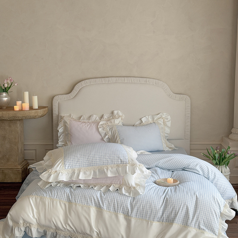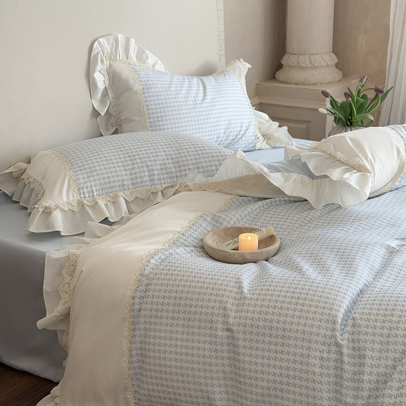 프랑스 공주 스타일 긴 스테이플 코튼 침대 시트 4 피스 세트 코튼 고급 Houndstooth 퀼트 커버 침구 파우더 블루